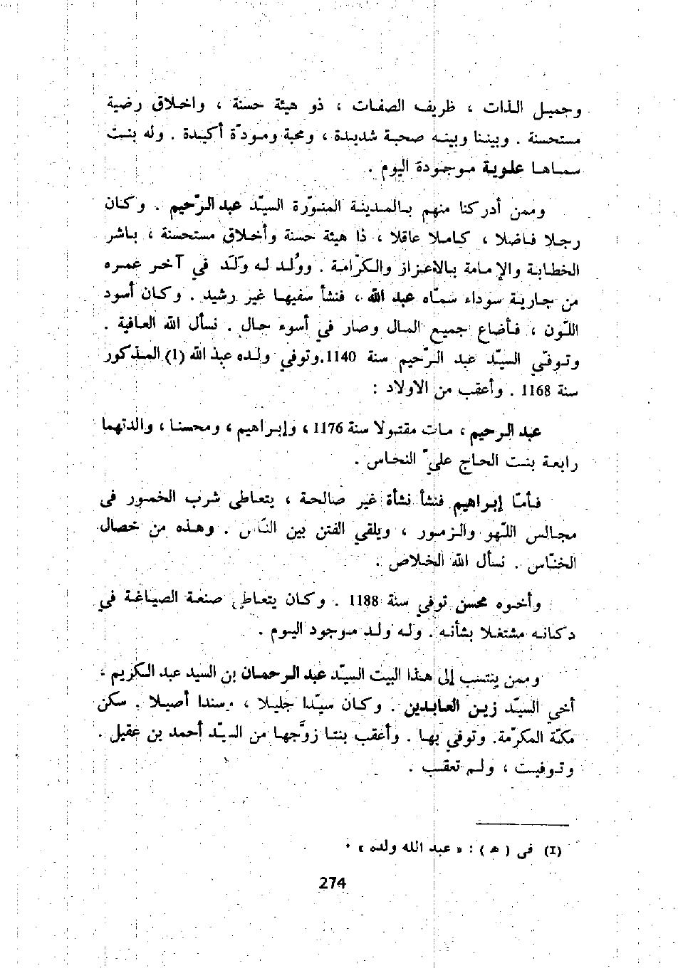 وممن أدركناه منهم بالمدينة المنورة السيد عبد الرحيم. وكان رجلاً فاضلاً، كاملاً عاقلاً، ذا هيئة حسنة وأخلاق مستحسنة، باشر الخطابة والإمامة بالإعزاز والكرامة. وولد له ولد في آخر عمره من جارية سوداء سماه عبد الله، فنشأ سفيهاً غير رشد. وكان أسود اللون، فأضاع جميع المال وصار في أسوء حال. نسأل الله العافية. وتوفي السيد عبد الرحيم سنة 1140. وتوفي عبد الله المذكور سنة 1168. وأعقب من الأولاد: عبد الرحيم، مات مقتولاً سنة 1176، وإبراهيم، ومحسناً، والدتهما رابعة بنت الحاج علي النحاس.