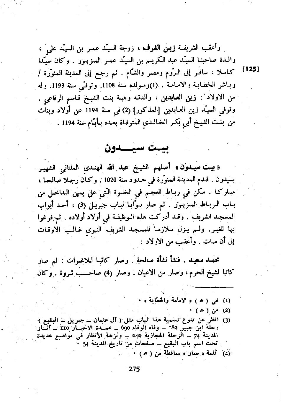 " بيت سيدون " أصلهم الشيخ عبد الله الهندي الملتاني الشهير بسيدون. قدم المدينة المنورة في حدود سنة 1020. وكان رجلاً صالحاً، مباركاً. سكن في رباط العجم في الخلوة التي على يمين الداخل من باب الرباط المزبور. ثم صار بواباً لباب جبريل، أحد أبواب المسجد الشريف. وقد أدركت هذه الوظيفة في أولاد أولاده. ثم فرغوا بها للغير. ولم يزل ملازماً للمسجد الشريف النبوي غالب الأوقات إلى أن مات. وأعقب من الأولاد: محمد سعيد. فنشأ نشأة صالحة. وصار كاتباً للآغوات. ثم صار كاتباً لشيخ الحرم، وصار من الأعيان. وصار صاحب ثروة. وكان
