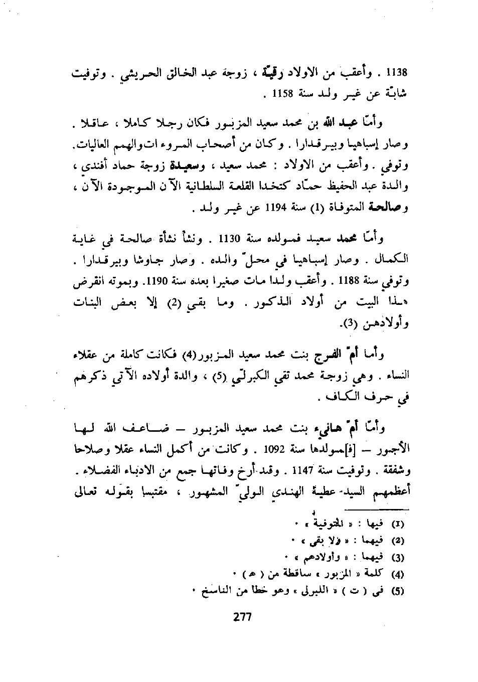 وأما أم هانئ بنت محمد سعيد المزبور - ضاعف الله لها الأجور - " ف " مولدها سنة 1092. وكانت من أكمل النساء عقلاً وصلاحاً وشفقة. وتوفيت سنة 1147. وقد أرخ وفاتها جمع من الأدباء والفضلاء. أعظمهم السيد عطية الهندي الولي المشهور، مقتبساً بقوله تعالى