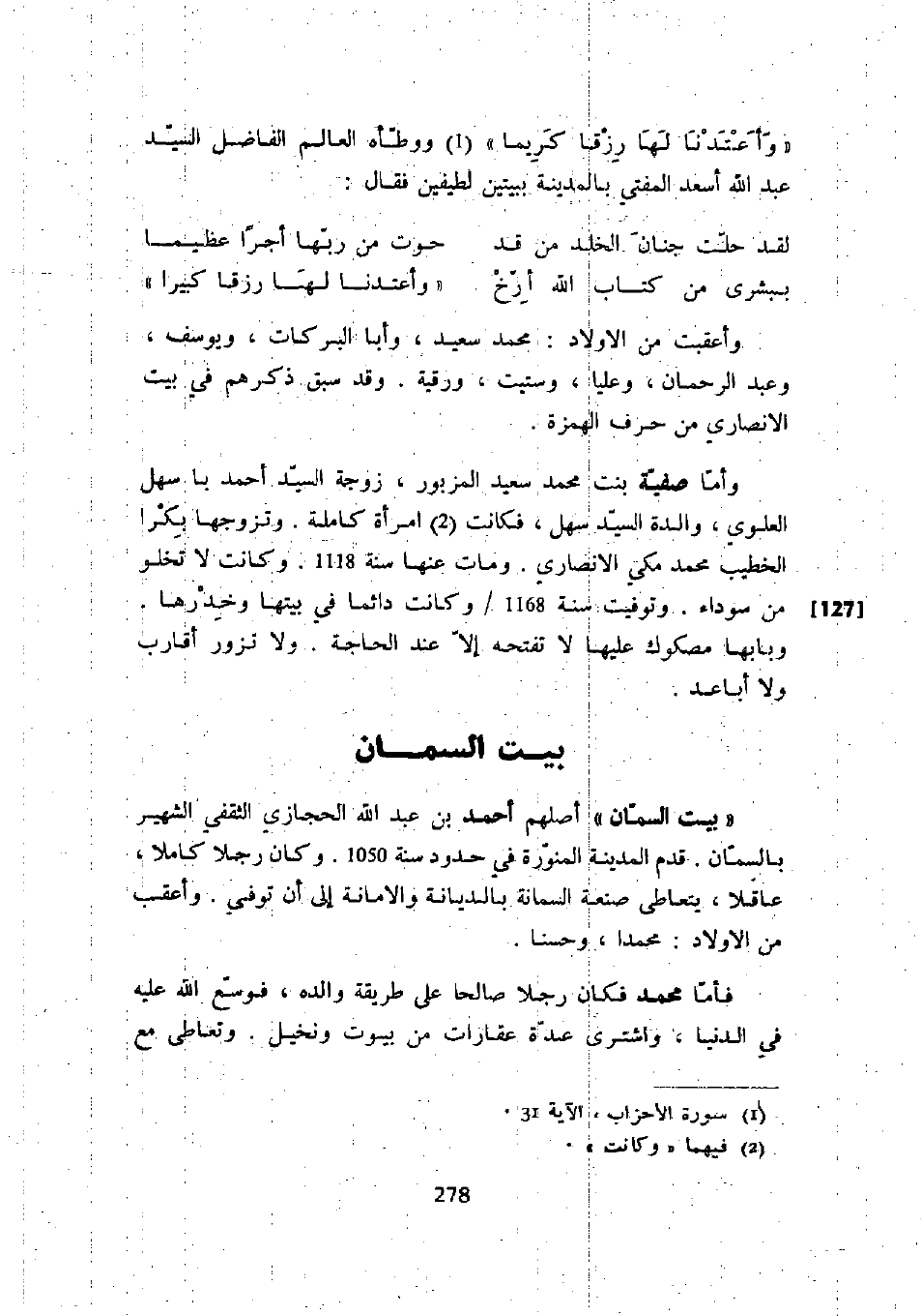 " بيت السمان " أصلهم أحمد بن عبد الله الحجازي الثقفي الشهير بالسمان. قدم المدينة المنورة في حدود سنة 1050. وكان رجلاً كاملاً، عاقلاً، يتعاطى صنعة السمانة بالديانة والأمانة إلى أن توفي. وأعقب من الأولاد: محمداً، وحسناً.