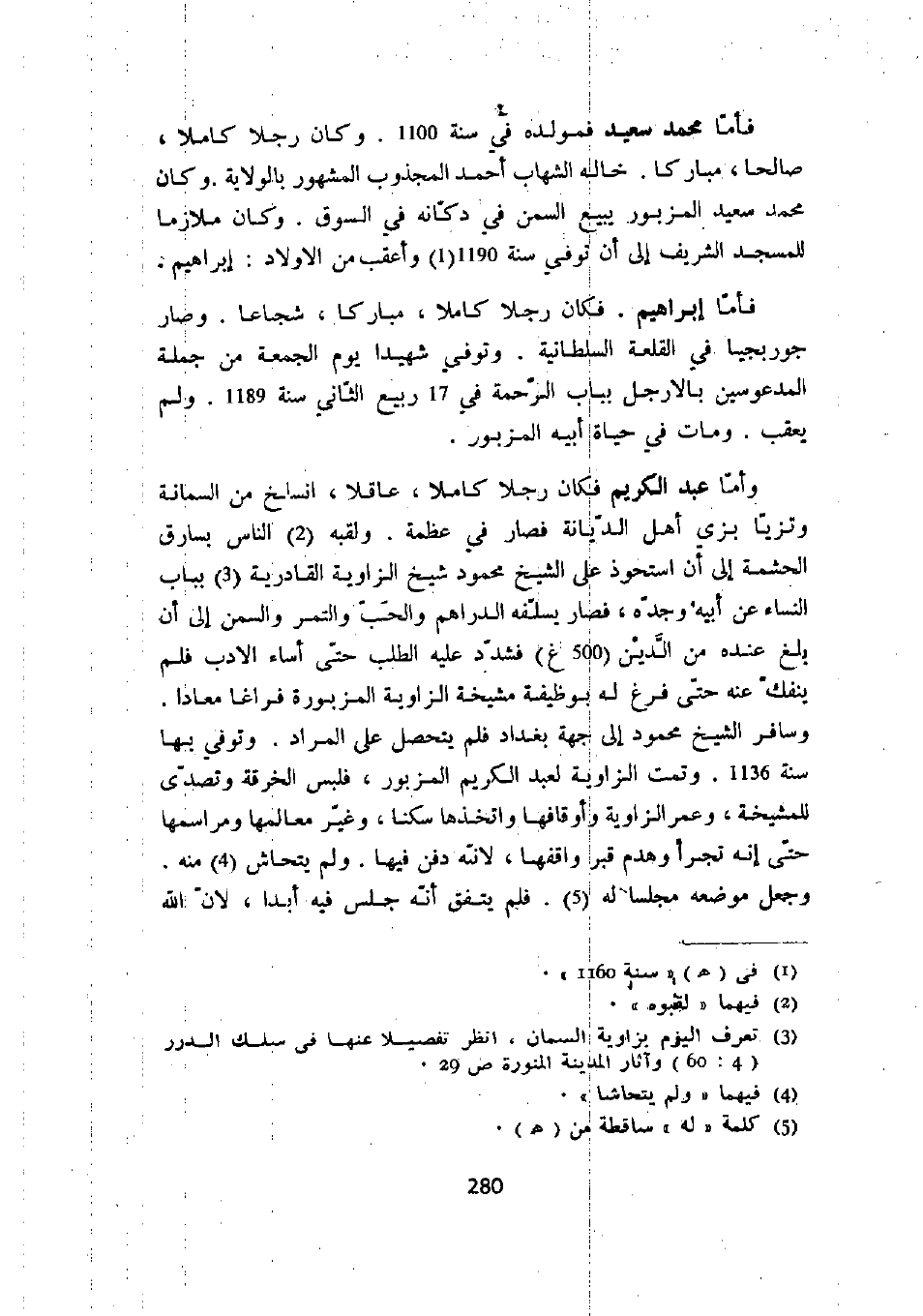 فأما محمد سعيد فمولده في سنة 1100. وكان رجلاً كاملاً، صالحاً، مباركاً. خاله الشهاب أحمد المجذوب المشهور بالولاية. وكان محمد سعيد المزبور يبيع السمن في دكانه في السوق. وكان ملازماً للمسجد الشريف إلى أن توفي سنة 1190 وأعقب من الأولاد: إبراهيم.