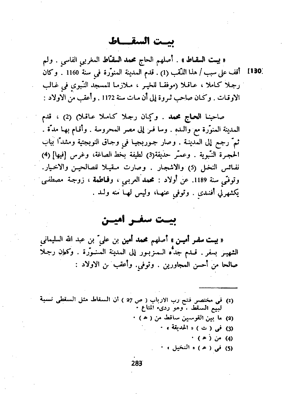 " بيت سفر أمين " أصلهم محمد أمين بن علي بن عبد الله السليماني الشهير بسفر. قدم جده المزبور إلى المدينة المنورة. وكان رجلاً صالحاً من أحسن المجاورين. وتوفي. وأعقب من الأولاد: