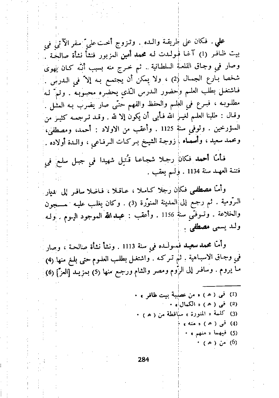 علي. فكان على طريقة والده. وتزوج أخت علي سفر الآتي في بيت ظافر آغا فولدت له محمد أمين المزبور فنشأ نشأة صالحة. وصار في وجاق القلعة السلطانية. ثم خرج منه بسبب أنه كان يهوى شخصاً بارع الجمال، ولا يمكن أن يجتمع إلا في الدرس. فاشتغل بطلب العلم وحضور الدرس الذي يحضره محبوبه. وتم له مطلوبه، فبرع في العلم والحفظ والفهم حتى صار يضرب به المثل. وقال: طلبنا العلم لغير الله فأبى أن يكون إلا لله. وقد ترجمه كثير من المؤرخين. وتوفي سنة 1125. وأعقب من الأولاد: أحمد، ومصطفى، ومحمد سعيد، وأسماء. زوجة الشيخ بركات الرفاعي، والدة أولاده.