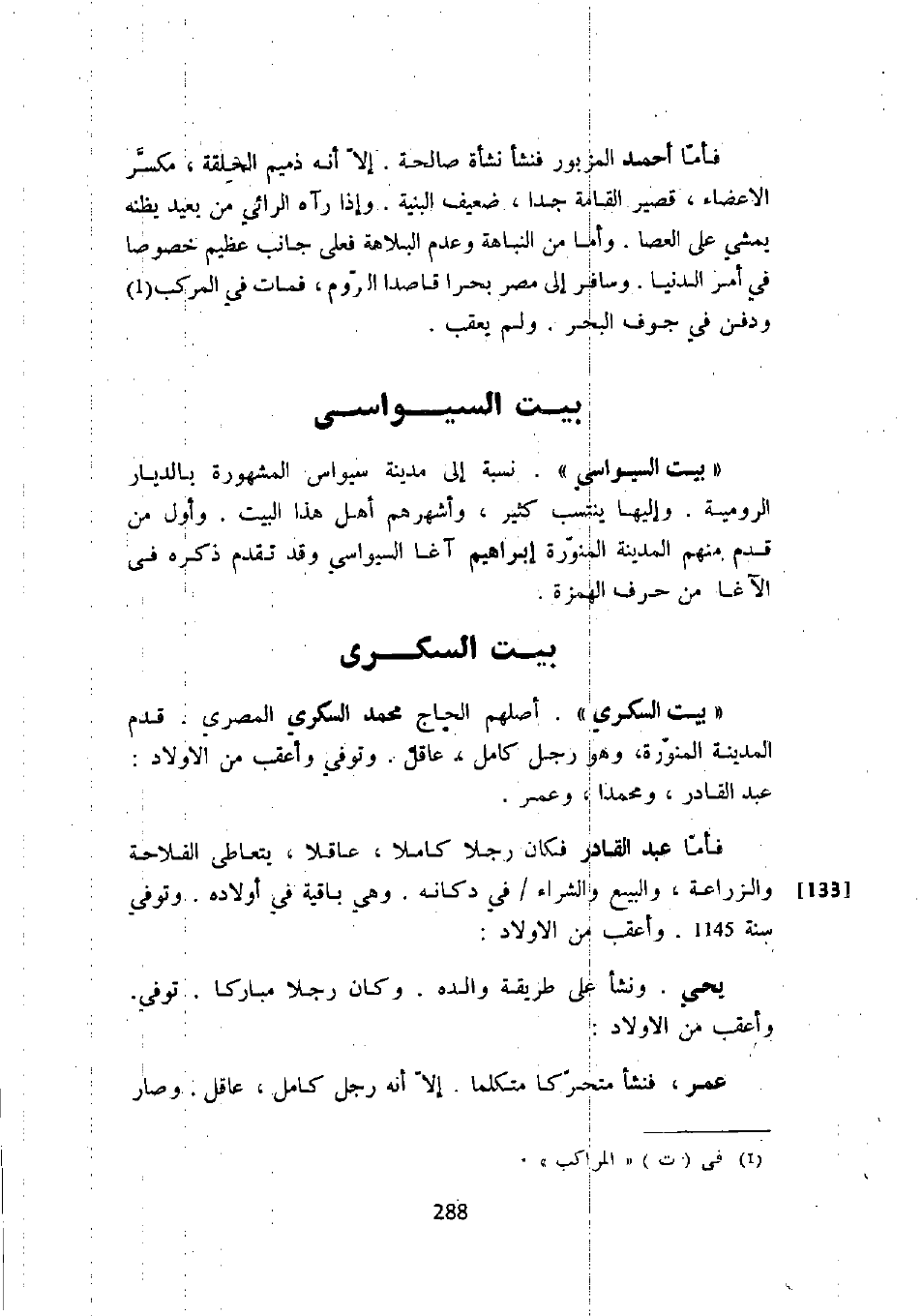 فأما عبد القادر فكان رجلاً كاملاً، عاقلاً، يتعاطى الفلاحة والزراعة، والبيع والشراء في دكانه. وهي باقية في أولاده. وتوفي سنة 1145. وأعقب من الأولاد: يحي. ونشأ على طريقة والده. وكان رجلاً مباركاً. وتوفي. وأعقب من الأولاد: عمر، فنشأ متحركاً متكلماً. إلا أنه رجل كامل، عاقل. وصار