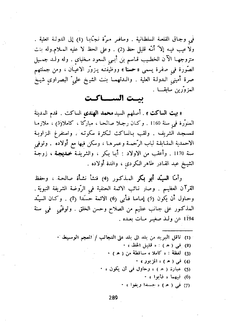 " بيت الساكت ". أصلهم السيد محمد الهندي الساكت. قدم المدينة المنورة في سنة 1160. وكان رجلاً صالحاً، مباركاً، كاملاً، ملازماً للمسجد الشريف. ولقب بالساكت لكثرة سكوته. واستفرغ الزاوية الأحمدية المقابلة لباب الرحمة وعمرها، وسكن فيها مع أولاده. وتوفي سنة 1170. وأعقب من الأولاد: أبا بكر، والشريفة خديجة، زوجة الشيخ عبد القادر طاهر الكردي، والدة أولاده.
