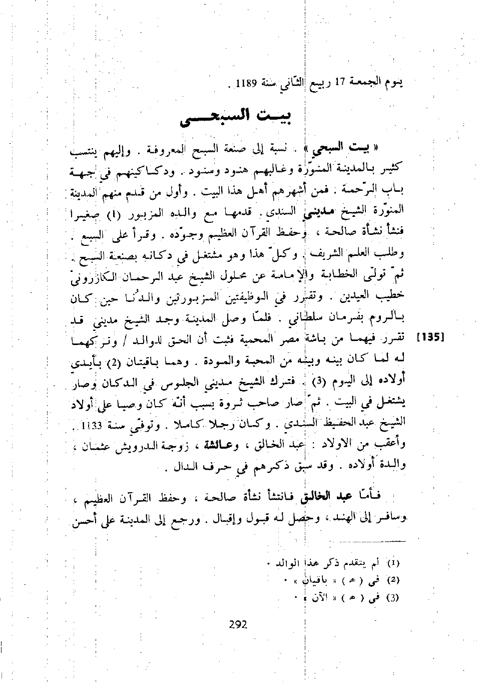 " بيت السبحي ". نسبة إلى صنعة السبح المعروفة. وإليهم ينتسب كثير بالمدينة المنورة وغالبهم هنود وسنود. ودكاكينهم في جهة باب الرحمة. فمن أشهرهم أهل هذا البيت. وأول من قدم منهم المدينة المنورة الشيخ مديني السندي. قدمها مع والده المزبور صغيراً فنشأ نشأة صالحة، وحفظ القرآن العظيم وجوده. وقرأ على السبع. وطلب العلم الشريف. وكل هذا وهو مشتغل في دكانه بصنعة السبح. ثم تولى الخطابة والإمامة عن محلول الشيخ عبد الرحمان الكازروني خطيب العيدين. وتقرر في الوظيفتين المزبورتين والدنا حين كان بالروم بفرمان سلطاني. فلما وصل المدينة وجد الشيخ مديني قد تقرر فيهما من باشة مصر المحمية فثبت أن الحق للوالد وتركهما له لما كان بينه وبينه من المحبة والمودة. وهما باقيتان بأيدي أولاده إلى اليوم. فترك الشيخ مديني الجلوس في الدكان وصار يشتغل في البيت، ثم صار صاحب ثروة بسبب أنه كان وصياً على أولاد الشيخ عبد الحفيظ السندي. وكان رجلاً كاملاً. وتوفي سنة 1133. وأعقب من الأولاد عبد الخالق وعائشة زوجة الدرويش عثمان والدة أولاده وقد سبق ذكرهم في حرف الدال.