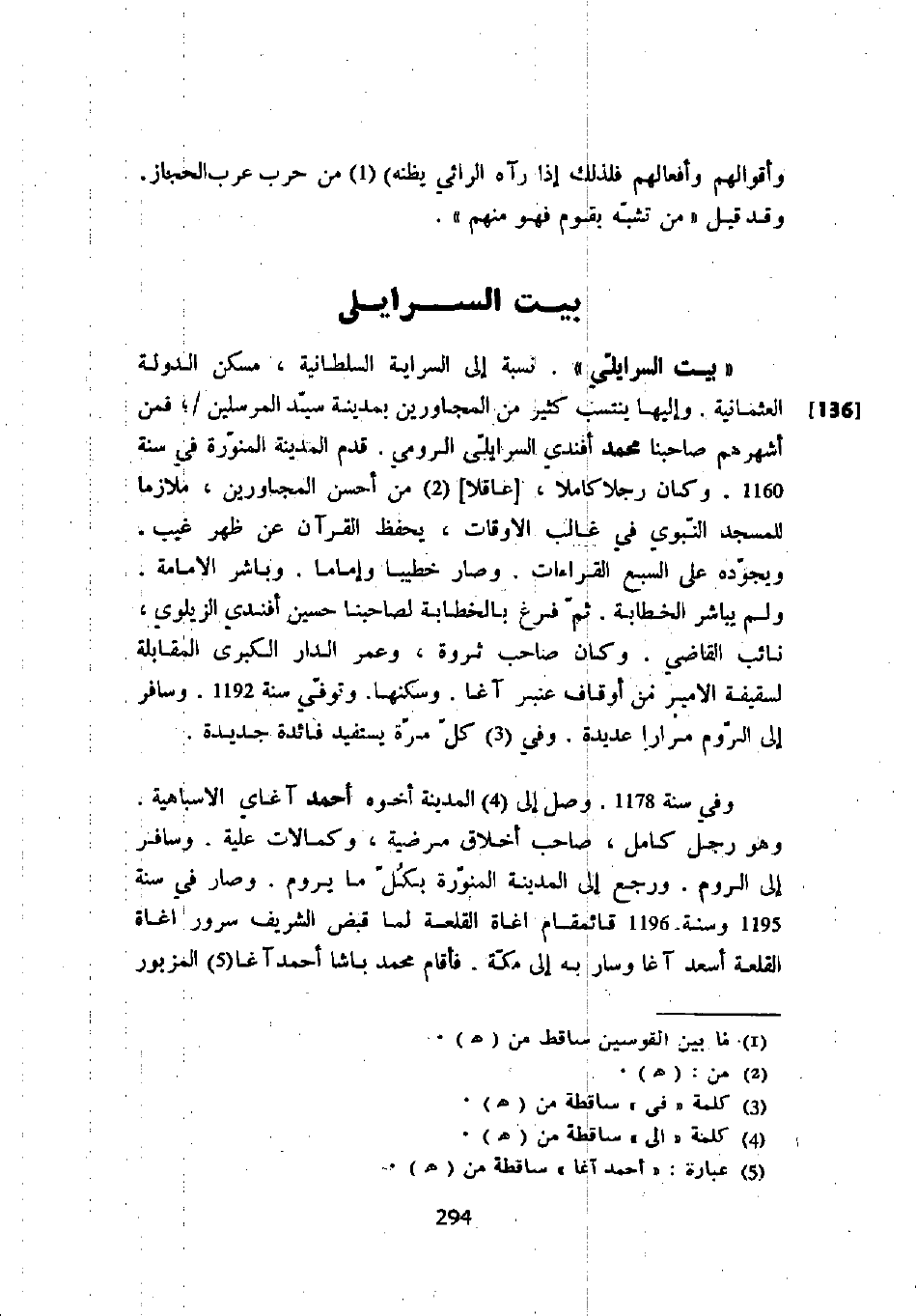 " بيت السرايلي ". نسبة إلى السراية السلطانية، مسكن الدولة العثمانية. وإليها ينتسب كثير من المجاورين بمدينة سيد المرسلين؛ فمن أشهرهم صاحبنا محمد أفندي السرايلي الرومي. قدم المدينة المنورة في سنة 1160. وكان رجلاً كاملاً، " عاقلاً " من أحسن المجاورين، ملازماً للمسجد النبوي في غالب الأوقات، يحفظ القرآن عن ظهر غيب. ويجوده على السبع القراءات. وصار خطيباً وإماماً. وباشر الإمامة. ولم يباشر الخطابة. ثم فرغ بالخطابة لصاحبنا حسين أفندي الزيلوي، نائب القاضي. وكان صاحب ثروة، وعمر الدار الكبرى المقابلة لسقيفة الأمير من أوقاف عنبر آغا. وسكنها. وتوفي سنة 1192. وسافر إلى الروم مراراً عديدة. وفي كل مرة يستفيد فائدة جديدة.