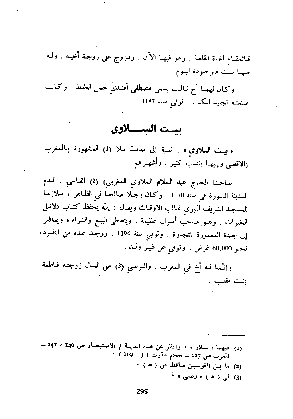 " بيت السلاوي ". نسبة إلى مدينة سلا المشهورة بالمغرب " الأقصى وإليها ينتسب كثير. وأشهرهم: صاحبنا الحاج عبد السلام السلاوي المغربي " الفاسي. قدم المدينة المنورة في سنة 1170. وكان رجلاً صالحاً في الظاهر، ملازماً للمسجد الشريف النبوي غالب الأوقات ويقال: إنه يحفظ كتاب دلائل الخيرات. وهو صاحب أموال عظيمة. ويتعاطى البيع والشراء، ويسافر إلى جدة المعمورة للتجارة. وتوفي سنة 1194. ووجد عنده من النقود نحو 60. 000 غرش. وتوفي عن غير ولد.