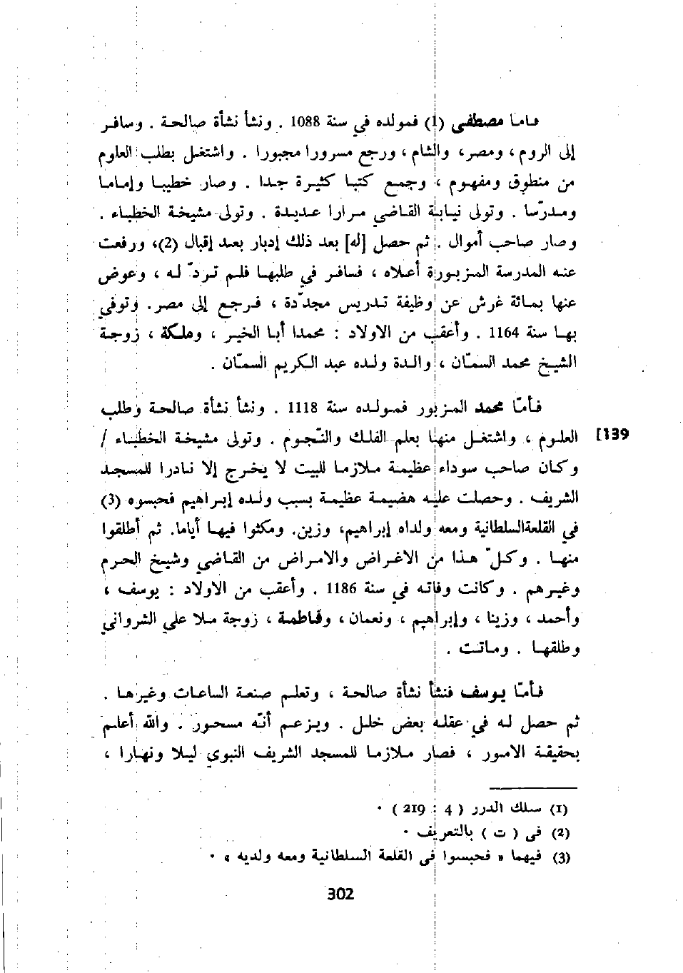 فأما مصطفى فمولده في سنة 1088. ونشأ نشأة صالحة. وسافر إلى الروم، ومصر، والشام، ورجع مسروراً مجبوراً. واشتغل بطلب العلوم من منطوق ومفهوم، وجمع كتباً مثيرة جداً. وصار خطيباً وإماماً ومدرساً. وتولى نيابة القاضي مراراً عديدة. وتولى مشيخة الخطباء. وصار صاحب أموال. ثم حصل " له " بعد ذلك إدبار بعد إقبال، ورفعت عنه المدرسة المزبورة أعلاه، فسافر في طلبها فلم ترد له، وعوض عنها بمائة غرش عن وظيفة تدريس مجددة، فرجع إلى مصر. وتوفي بها سنة 1164. وأعقب من الأولاد: محمد أبا الخير، وملكة، زوجة الشيخ محمد السمان، والدة ولده عبد الكريم السمان.