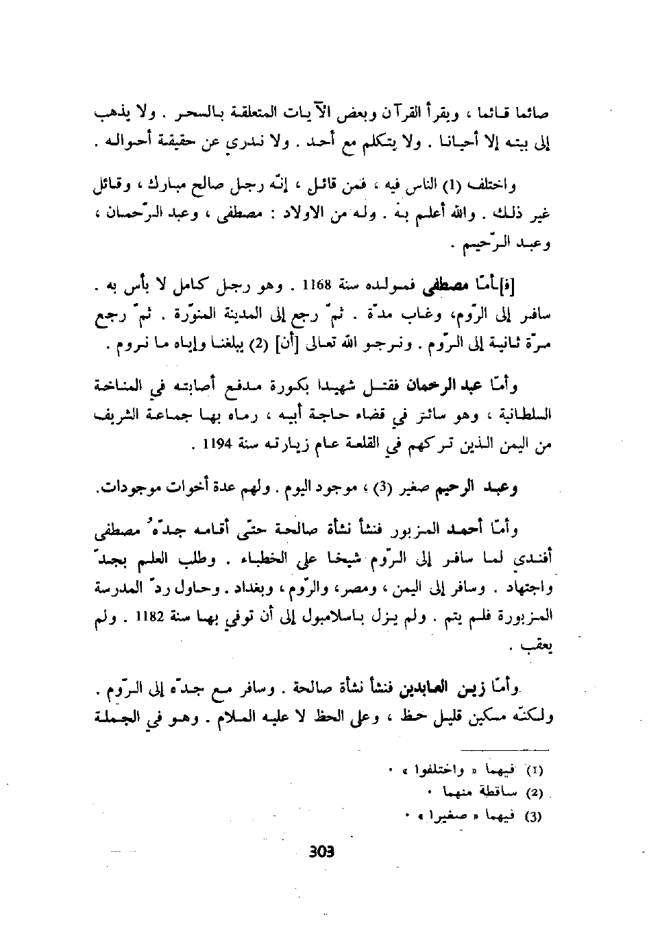 " ف " أما مصطفى فمولده سنة 1168. وهو رجل كامل لا بأس به. سافر إلى الروم، وغاب مدة. ثم رجع إلى المدينة المنورة. ثم رجع مرة ثانية إلى الروم. ونرجو الله تعالى " أن " يبلغنا وإياه ما يروم.