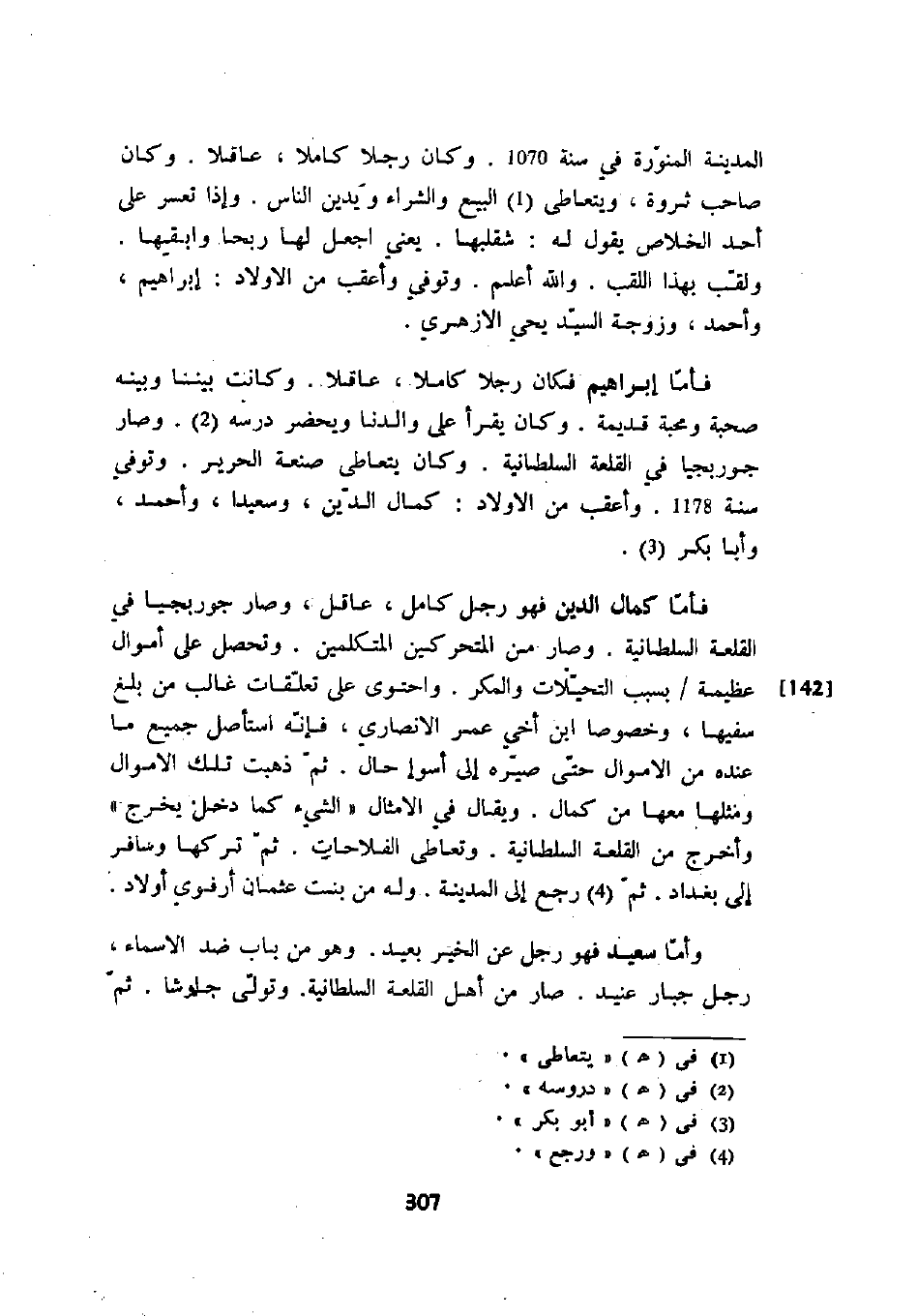 فأما إبراهيم فكان رجلاً كاملاً، عاقلاً. وكان بيننا وبينه صحبة ومحبة قديمة. وكان قرأ على والدنا ويحضر درسه. وصار جوربجياً في القلعة السلطانية. وكان يتعاطى صنعة الحرير. وتوفي سنة 1178. وأعقب من الأولاد: كمال الدين، وسعيداً، وأحمد، وأبا بكر.