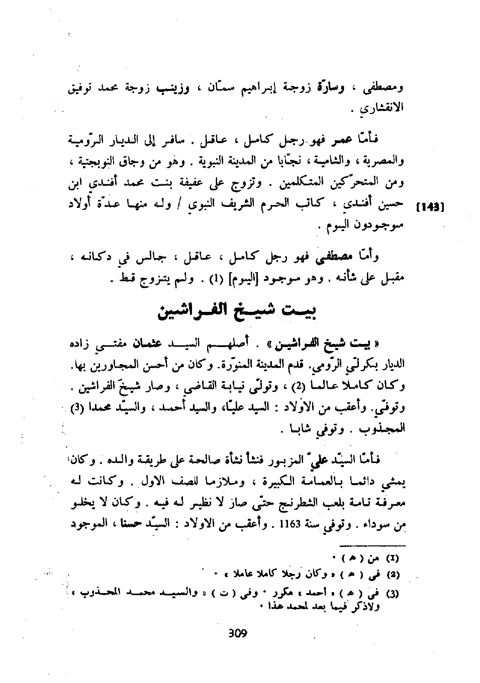 " بيت شيخ الفراشين ". أصلهم السيد عثمان مفتي زاده الديار بكرلي الرومي. قدم المدينة المنورة. وكان من أحسن المجاورين بها. وكان كاملاً عالماً، وتولى نيابة القاضي، وصار شيخ الفراشين. وتوفي. وأعقب من الأولاد: السيد علياً، والسيد أحمد، والسيد محمداً المجذوب. وتوفي شاباً.