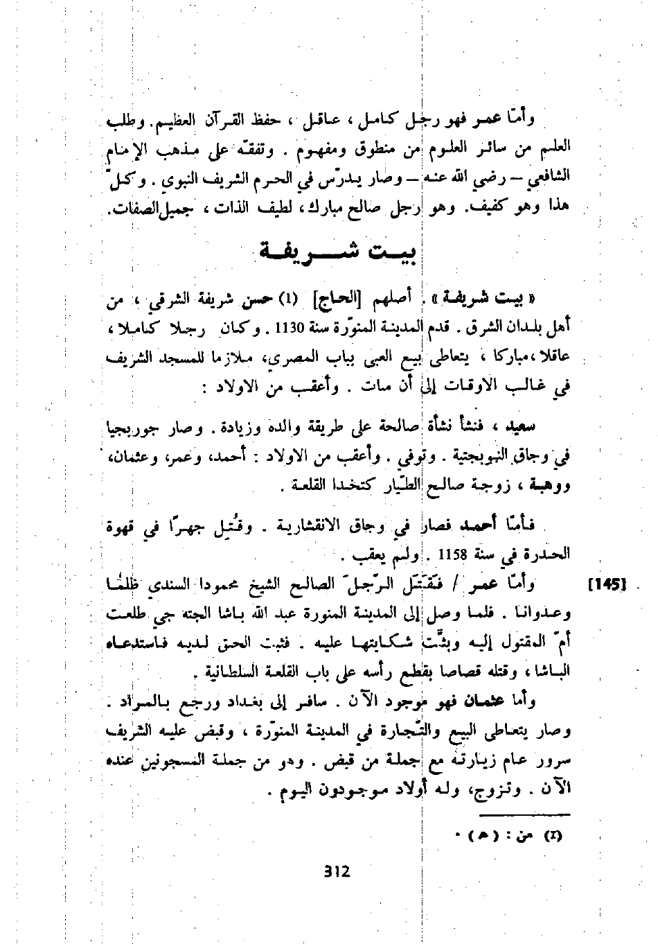 " بيت شريفة ". أصلهم " الحاج " حسن شريفة الشرقي، من أهل بلدان الشرق. قدم المدينة المنورة سنة 1130. وكان رجلاً كاملاً، عاقلاً مباركاً، يتعاطى بيع العبى بباب المصري، ملازماً للمسجد الشريف في غالب الأوقات إلى أن مات. وأعب من الأولاد: سعيد، فنشأ نشأة صالحة على طريقة والده وزيادة. وصار جوربجياً في وجاق النوبجتية. وتوفي. وأعقب من الأولاد: أحمد، وعمر، وعثمان، ووهبة، زوجة صالح الطيار كتخدا القلعة.
