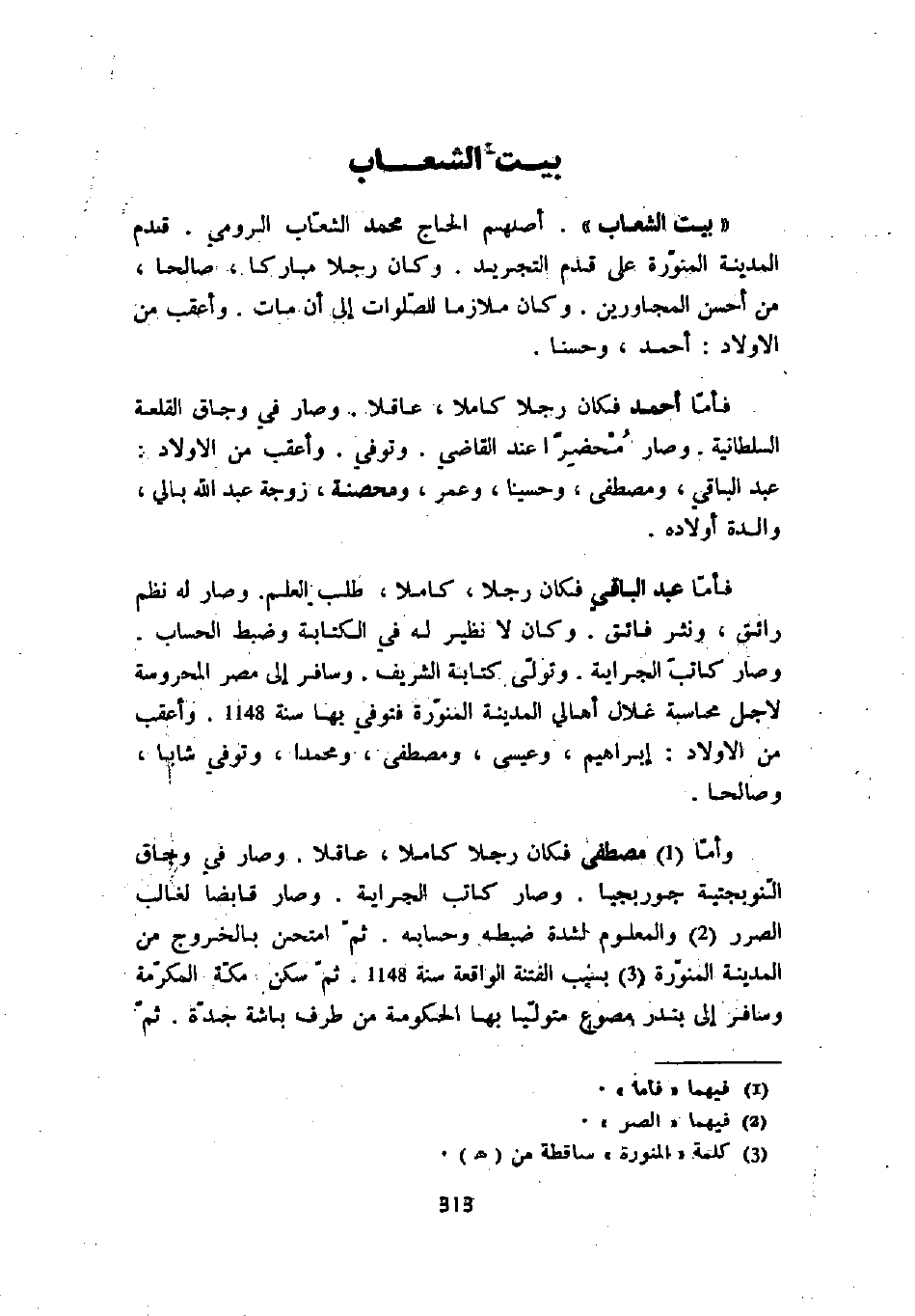 " بيت الشعاب ". أصلهم محمد الشعاب الرومي. قدم المدينة المنورة على قدم التجريد. وكان رجلاً مباركاً، صالحاً، من أحسن المجاورين. وكان ملازماً للصلوات إلى أن مات. وأعقب من الأولاد: أحمد، وحسناً.