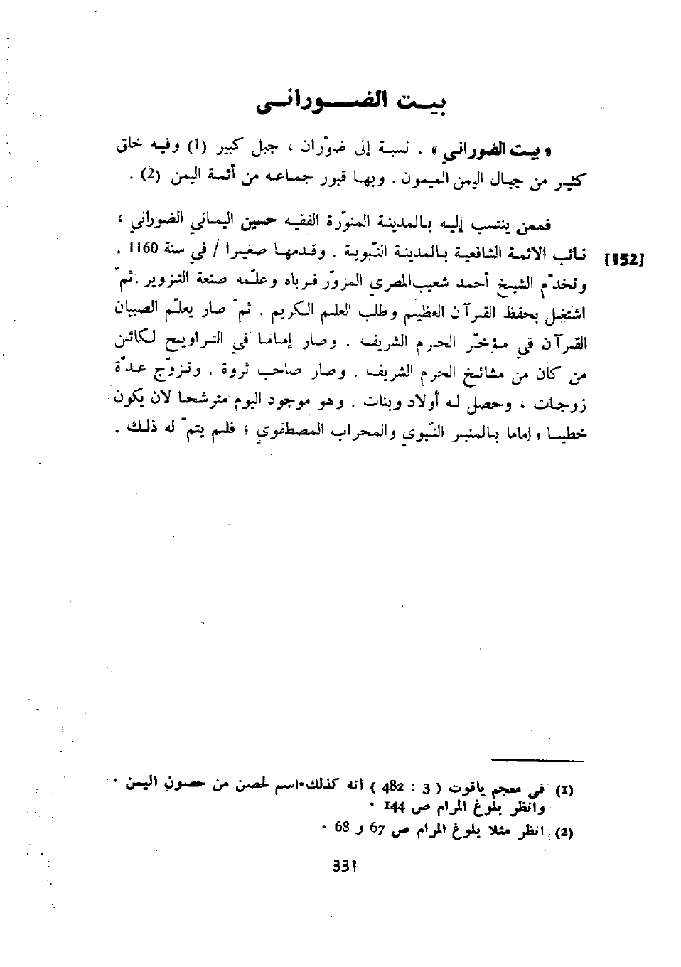 فممن ينتسب إليه بالمدينة المنورة الفقيه حسين اليماني الضوراني، نائب الأئمة الشافعية بالمدينة النبوية. وقدمها صغيراً في سنة 1160. وتخدم الشيخ أحمد شعيب المصري المزور فرباه وعلمه صنعة التزوير. ثم اشتغل بحفظ القرآن العظيم وطلب العلم الكريم. ثم صار يعلم الصبيان القرآن في مؤخر الحرم الشريف. وصار إماماً في التراويح لكائن من كان من مشايخ الحرم الشريف. وصار صاحب ثروة. وتزوج عدة زوجات، وحصل له أولاد وبنات. وهو موجود اليوم مترشحاً لأن يكون خطيباً وإماماً بالمنبر النبوي والمحراب المصطفوي؛ فلم يتم له ذلك.