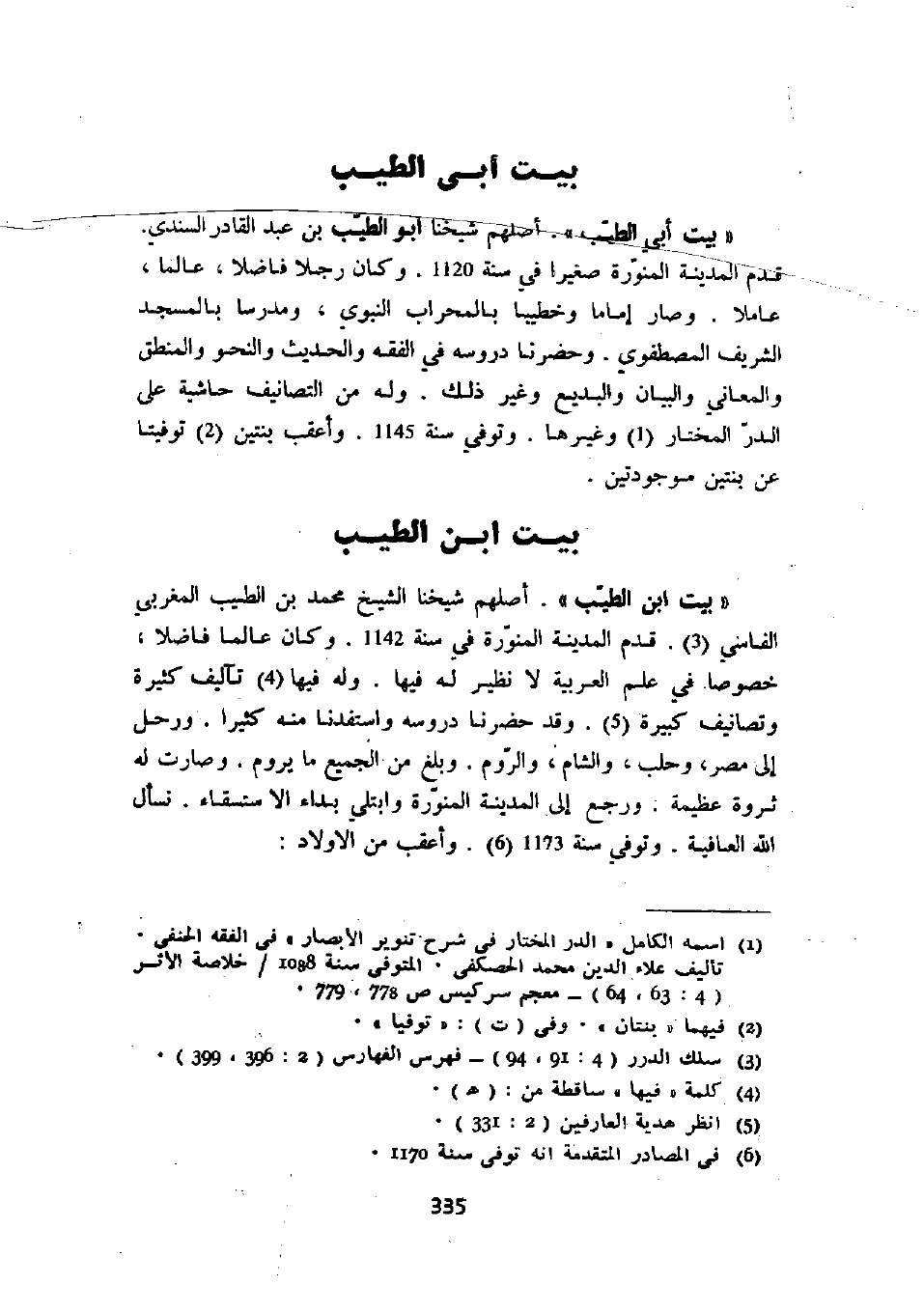 " بيت أبي الطيب ". أصلهم شيخنا أبو الطيب بن عبد القادر السندي. قدم المدينة المنورة صغيراً في سنة 1120. وكان رجلاً فاضلاً، عالماً، عاملاً. وصار إماماً وخطيباً بالمحراب النبوي، ومدرساً بالمسجد الشريف المصطفوي. وحضرنا دروسه في الفقه والحديث والنحو والمنطق والمعاني والبيان والبديع وغير ذلك. وله من التصانيف حاشية على الدر المختار وغيرها. وتوفي سنة 1145. وأعقب بنتين توفيتا عن بنتين موجودتين.