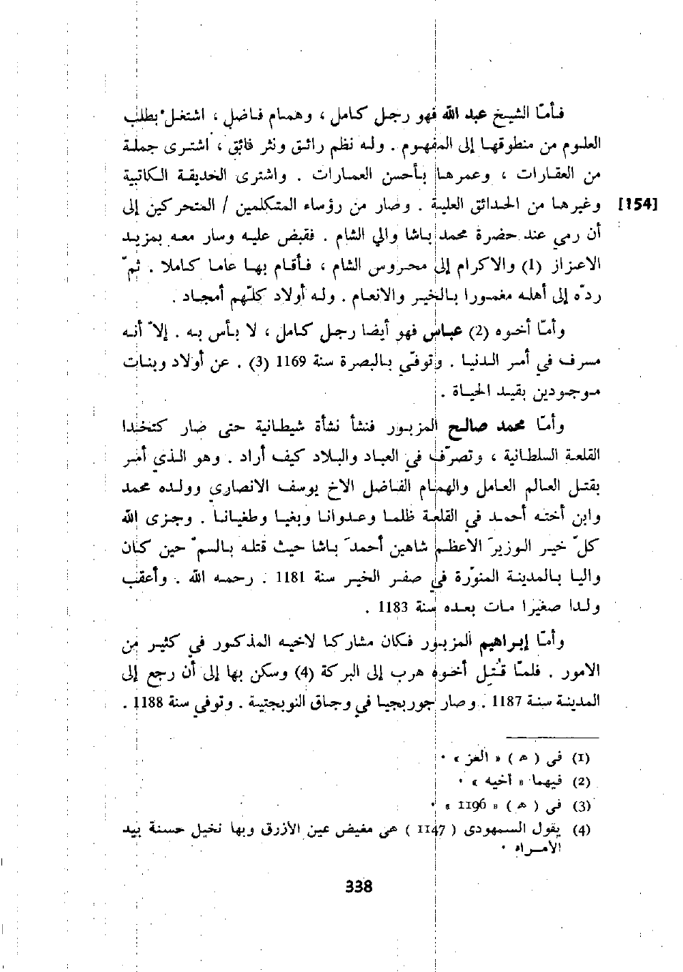 فأما الشيخ عبد الله فهو رجل كامل، وهمام فاضل، اشتغل بطلب العلوم من منطوقها إلى المفهوم. وله نظم رائق ونثر فائق، اشترى جملة من العقارات، وعمرها بأحسن العمارات. واشترى الحديقة الكاتبية وغيرها من الحدائق العلية. وصار من رؤساء المتكلمين المتحركين إلى أن رمي عند حضرة محمد باشا والي الشام. فقبض عليه وسار معه بمزيد الإعزاز والإكرام إلى محروس الشام، فأقام بها عاماً كاملاً. ثم رده إلى أهله مغموراً بالخير والإنعام. وله أولاد كلهم أمجاد.