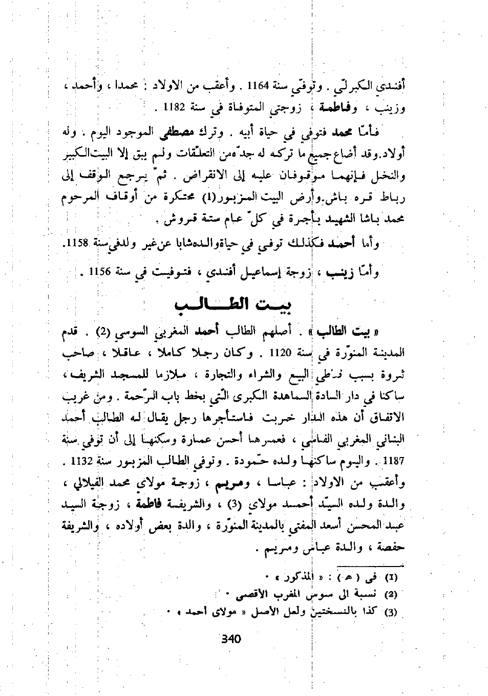 " بيت الطالب ". أصلهم الطالب أحمد المغربي السوسي. قدم المدينة المنورة في سنة 1120. وكان رجلاً كاملاً، عاقلاً، صاحب ثروة بسبب تعاطي البيع والشراء والتجارة، ملازماً للمسجد الشريف، ساكناً في دار السادة السماهدة الكبرى التي بخط باب الرحمة. ومن غربي الاتفاق أن هذه الدار خربت فاستأجرها رجل يقال له الطالب أحمد البناني المغربي الفاسي، فعمرها أحسن عمارة وسكنها إلى أن توفي سنة 1187. واليوم ساكنها ولده حمودة. وتوفي الطالب المزبور سنة 1132. وأعقب من الأولاد: عباساً، ومريم، زوجة مولاي محمد الفيلالي، والدة ولده السيد أحمد مولاي، والشريفة فاطمة، زوجة السيد عبد المحسن أسعد المفتي بالمدينة المنورة، والدة بعض أولاده، والشريفة حفصة، والدة عباس ومريم.
