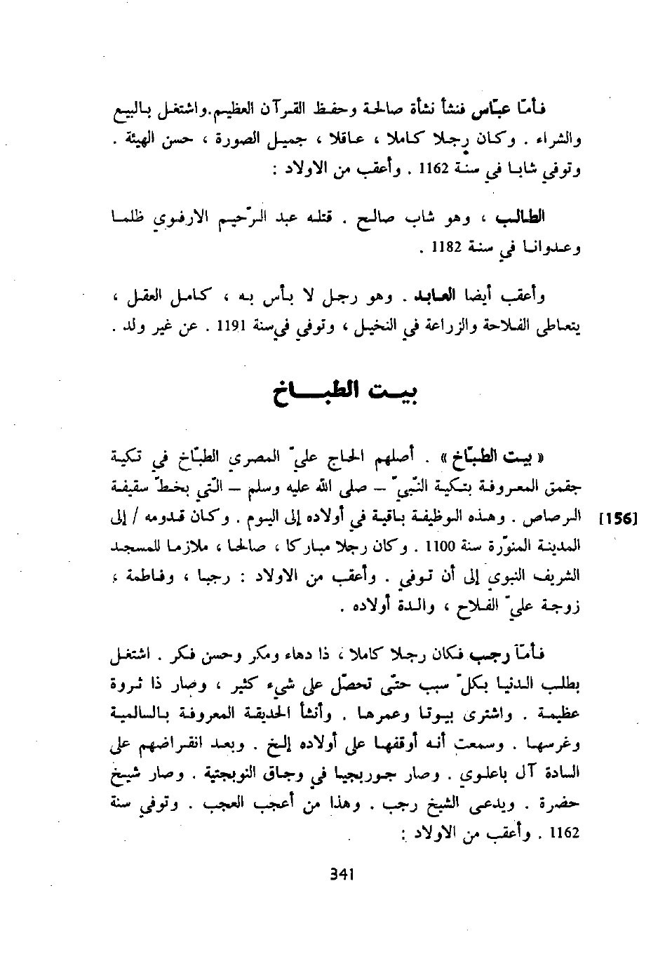 " بيت الطباخ ". أصلهم الحاج علي المصري الطباخ في تكية جقمق المعروفة بتكية النبي - صلى الله عليه وسلم - التي بخط سقيفة الرصاص. وهذه الوظيفة باقية في أولاده إلى اليوم. وكان قدومه إلى المدينة المنورة سنة 1100. وكان رجلاً مباركاً، صالحاً، ملازماً للمسجد الشريف النبوي إلى أن توفي. وأعقب من الأولاد: رجباً، وفاطمة، زوجة علي الفلاح، والدة أولاده.