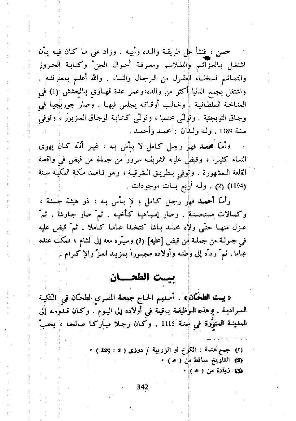 فأما محمد فهو رجل كامل لا بأس به، غير أنه كان يهوى النساء كثيراً، وقبض عليه الشريف سرور من جملة من قبض في واقعة القلعة المشهورة. وتوفي بطريق الشرقية، وهو قاصد مكة المكية سنة " 1194 " وله أربع بنات موجودات.