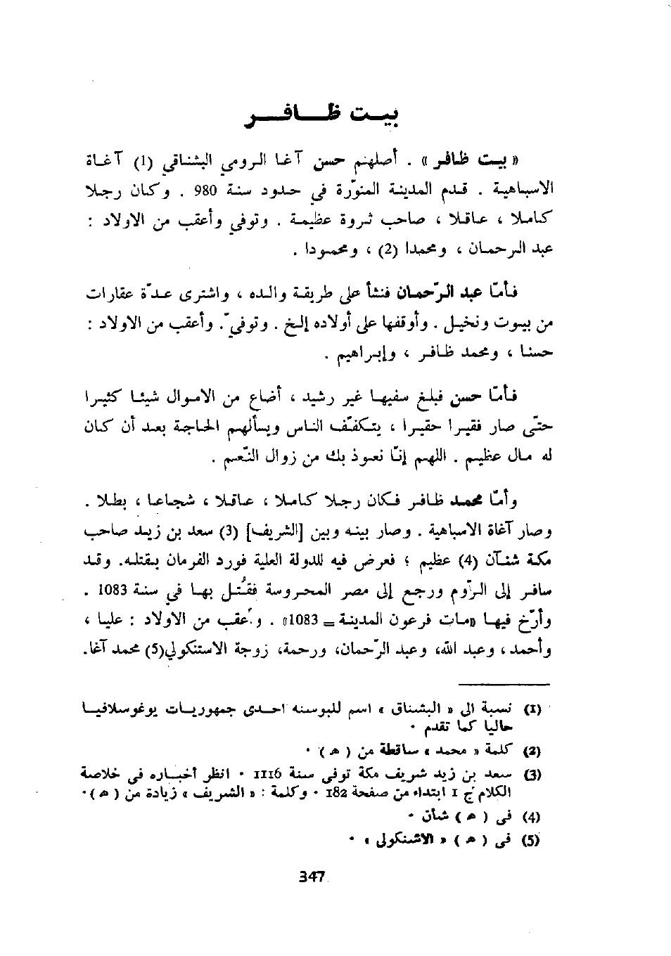 " بيت ظافر ". أصلهم حسن آغا الرومي البشناقي آغاة الإسباهية. قدم المدينة المنورة في حدود سنة 980. وكان رجلاً كاملاً، صاحب ثروة عظيمة. وتوفي وأعقب من الأولاد: عبد الرحمان، ومحمداً، ومحموداً.