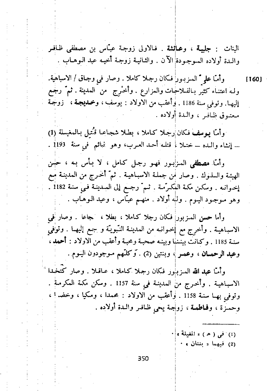 وأما مصطفى المزبور فهو رجل كامل، لا بأس به، حسن الهيئة والسلوك. وصار من جملة الإسباهية. ثم أخرج من المدينة مع إخوانه. وسكن مكة المكرمة. ثم رجع إلى المدينة في سنة 1182. وهو موجود اليوم. وله أولاد. منهم عباس، وعبد الوهاب.