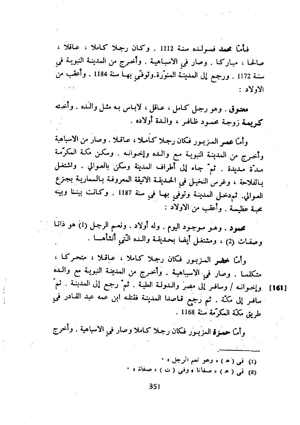 فأما محمد فمولده سنة 1112. وكان رجلاً كاملاً، عاقلاً، صالحاً، مباركاً. وصار في الإسباهية. وأخرج من المدينة النبوية في سنة 1172. ورجع إلى المدينة المنورة. وتوفي بها سنة 1184. وأعقب من الأولاد: معتوق. وهو رجل كامل، عاقل، لا بأس به مثل والده. وأخته كريمة زوجة محمود ظافر، والدة أولاده.