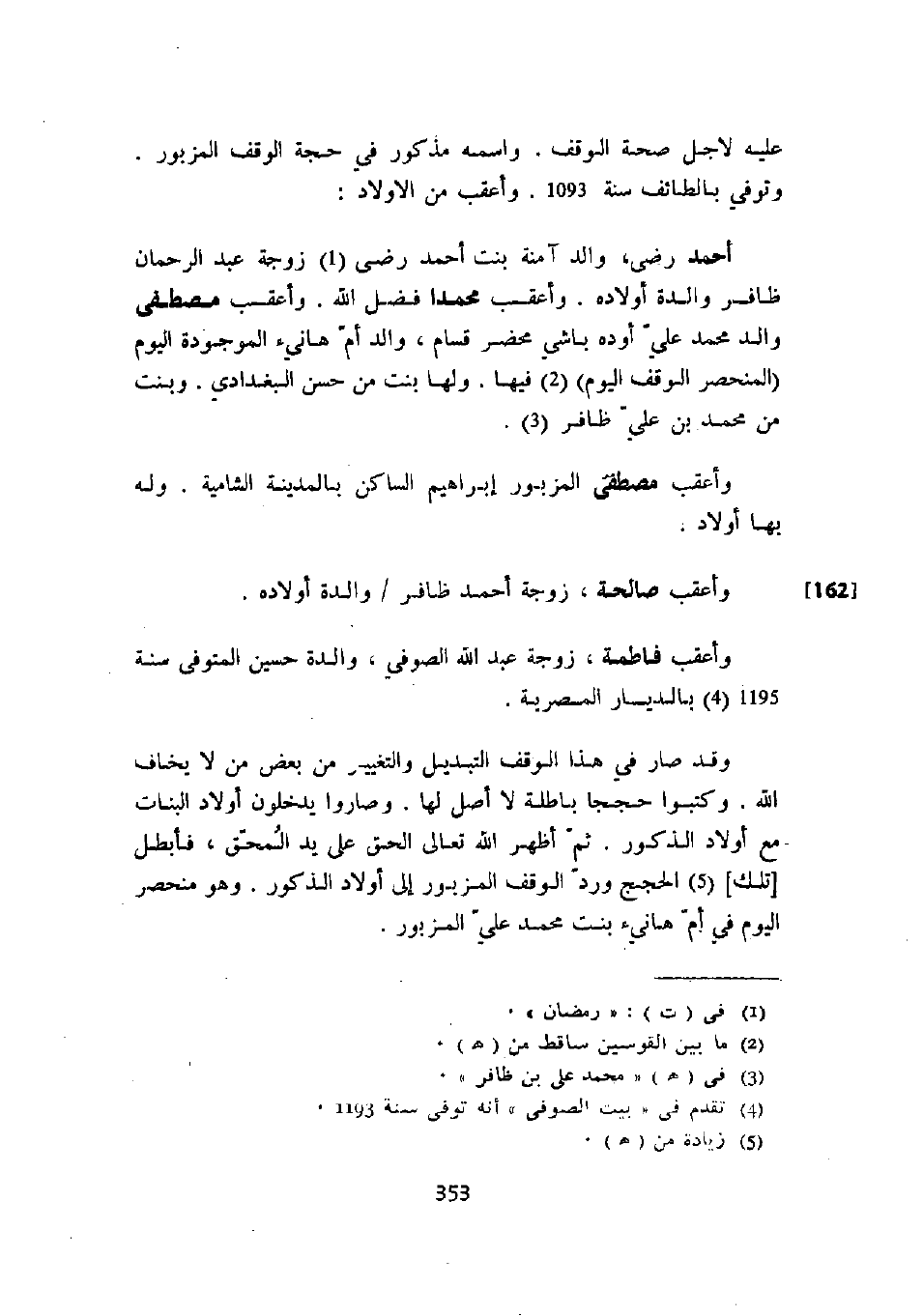 وقد صار في هذا الوقف التبديل والتغيير من بعض من لا يخاف الله. وكتبوا حججاً باطلة لا أصل لها. وصاروا يدخلون أولاد البنات مع أولاد الذكور. ثم أظهر الله تعالى الحق على يد المحق، فأبطل " تلك " الحجج ورد الوقف المزبور إلى أولاد الذكور. وهو منحصر اليوم في أم هانئ بنت محمد علي المزبور.