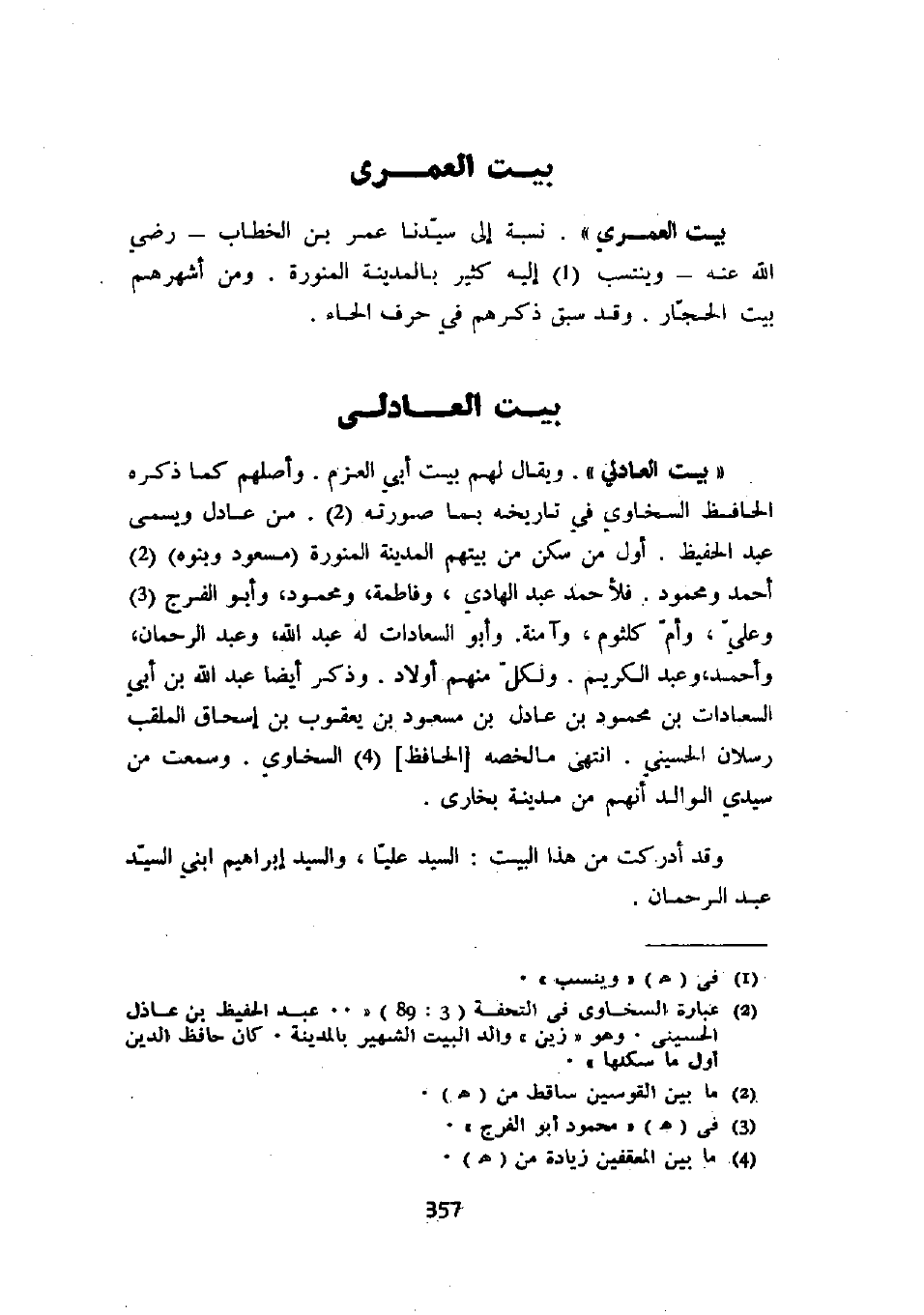 " بيت العادلي ". ويقال لهم بيت أبي العزم. وأصلهم كما ذكره الحافظ السخاوي في تاريخه بما صورته. من عادل ويسمى عبد الحفيظ. أول من سكن من بيتهم المدينة المنورة " مسعود وبنوه " أحمد ومحمود. فلأحمد عبد الهادي، وفاطمة، ومحمود، وأبو الفرج وعلي، وأم كلثوم، وآمنة. وأبو السعادات له عبد الله، وعبد الرحمان، وأحمد، وعبد الكريم. ولكل منهم أولاد. وذكر أيضاً عبد الله بن أبي السعادات بن محمود بن عادل بن مسعود بن يعقوب بن إسحاق الملقب رسلان الحسيني. انتهى ما لخصه " الحافظ " السخاوي. وسمعت من سيدي الوالد أنهم من مدينة بخارى.