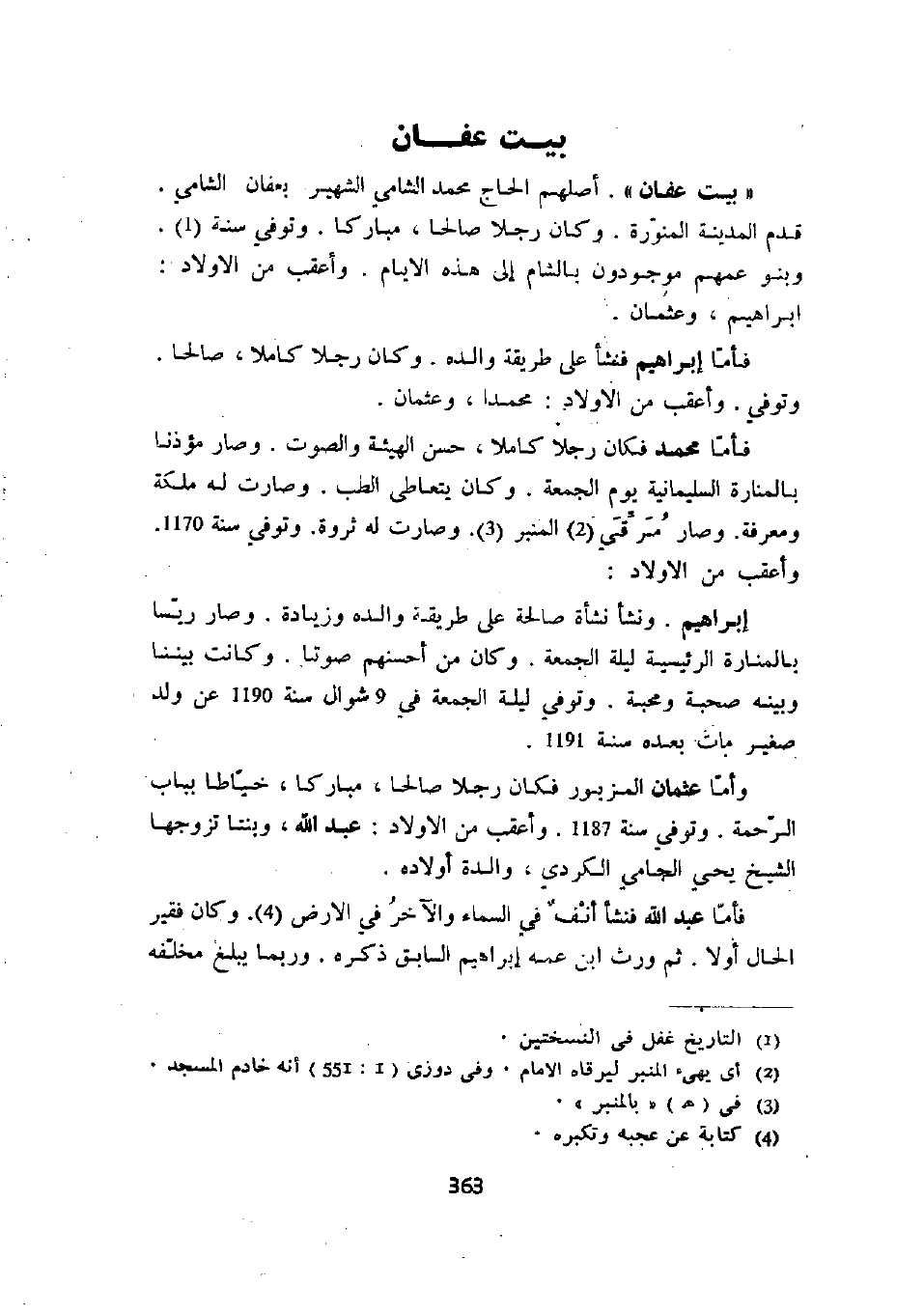 " بيت عفان ". أصلهم الحاج محمد الشامي الشهير بعفان الشامي. قدم المدينة المنورة. وكان رجلاً صالحاً، مباركاً. وتوفي سنة. وبنو عمهم موجودون بالشام هذه الأيام. وأعقب من الأولاد: إبراهيم، وعثمان.