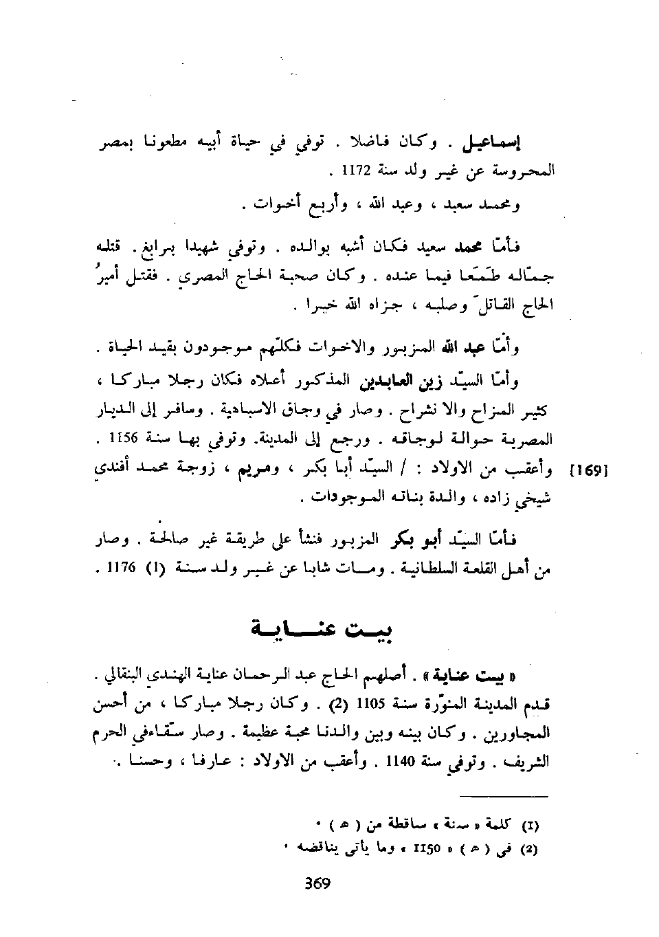 " بيت عناية ". أصلهم الحاج عبد الرحمان عناية الهندي البنقالي. قدم المدينة المنورة سنة 1105. وكان رجلاً مباركاً، من أحسن المجاورين. وكان بينه وبين والدنا محبة عظيمة. وصار سقاء في الحرم الشريف. وتوفي سنة 1140. وأعقب من الأولاد: عارفاً، وحسناً.