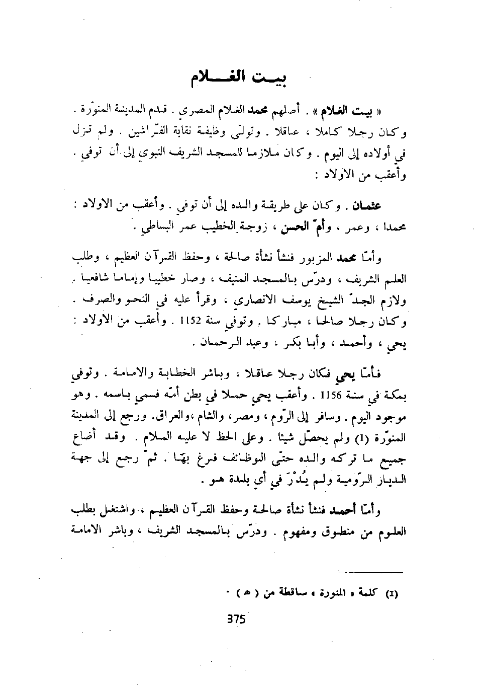 " بيت الغلام ". أصلهم محمد الغلام المصري. قدم المدينة المنورة. وكان رجلاً كاملاً، عاقلاً. وتولى وظيفة نقابة الفراشين. ولم تزل في أولاد إلى اليوم. وكان ملازماً للمسجد الشريف النبوي إلى أن توفي. وأعقب من الأولاد: عثمان. وكان على طريقة والده إلى أن توفي. وأعقب من الأولاد: محمداً، وعمر، وأم الحسن، زوجة الخطيب عمر البساطي.