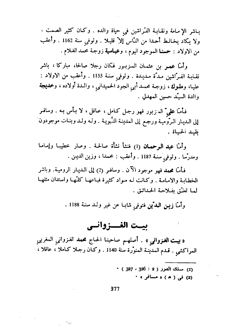 " بيت الغزواني ". أصلهم صاحبنا الحاج محمد الغزواني المغربي المراكشي. قدم المدينة المنورة سنة 1140. وكان رجلاً كاملاً، عاقلاً،