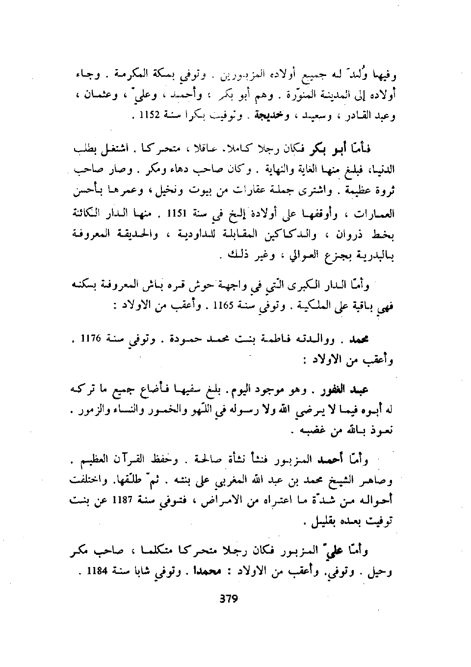 وفيها ولد له جميع أولاده المزبورين. وتوفي بمكة المكرمة. وجاء أولاده إلى المدينة المنورة. وهم أبو بكر، وأحمد، وعلي، وعثمان، وعبد القادر، وسعيد، وخديجة. وتوفيت بكراً سنة 1152.