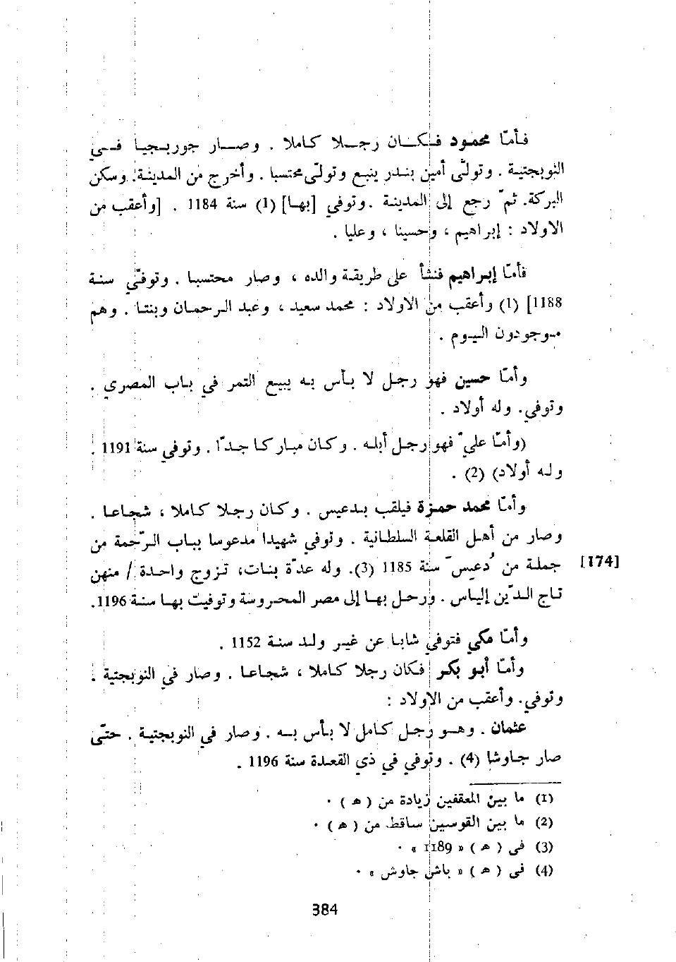 وأما أبو بكر فكان رجلاً كاملاً، شجاعاً. وصار في النوبجتية. وتوفي. وأعقب من الأولاد: عثمان. وهو رجل كامل لا بأس به. وصار في النوبجتية. حتى صار جاوشاً. وتوفي في ذي القعدة سنة 1196.