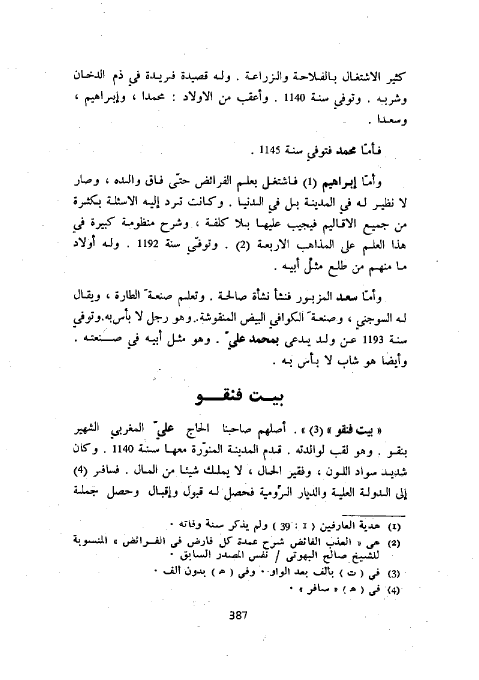وأما إبراهيم فاشتغل بعلم الفرائض حتى فاق والده، وصار لا نظير له في المدينة بل في الدنيا. وكانت ترد إليه الأسئلة بكثرة من جميع الأقاليم فيجيب عليها بلا كلفة، وشرح منظومة كبيرة في هذا العلم على المذاهب الأربعة. وتوفي سنة 1192. وله أولاد ما منهم طلع مثل أبيه.