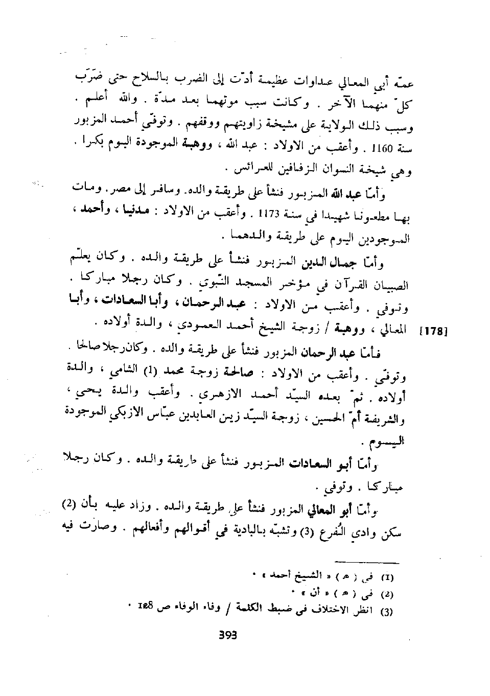 عمه أبي المعالي عداوات عظيمة أدت إلى الضرب بالسلاح حتى ضرب كل منهما الآخر. وكانت سبب موتهما بعد مدة. والله أعلم. وسبب ذلك الولاية على مشيخة زاويتهم ووقفهم. وتوفي أحمد المزبور سنة 1160. وأعقب من الأولاد: عبد الله، ووهبة الموجودة اليوم بكراً. وهي شيخة النسوان الزفافين للعرائس.