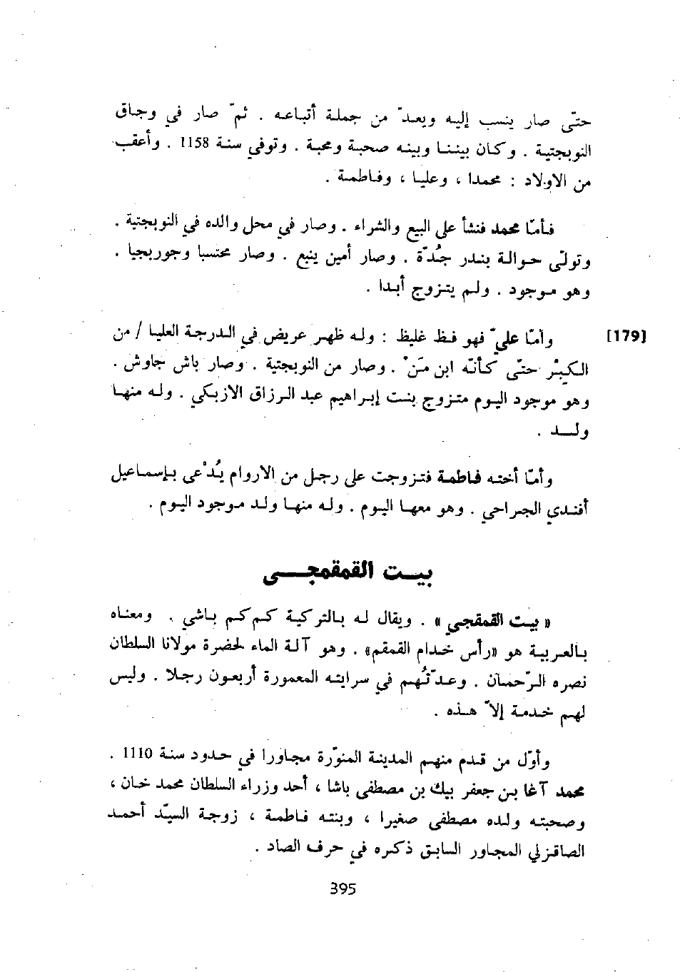 " بيت القمقمجي ". ويقال له بالتركية كم كم باشي. ومعناه بالعربية هو " رأس خدام القمقم ". وهو آلة الماء لحضرة مولانا السلطان نصره الرحمان. وعدتهم في سرايته المعمورة أربعون رجلاً. وليس لهم خدمة إلا هذه. وأول من قدم منهم المدينة المنورة مجاوراً في حدود سنة 1110. محمد آغا بن جعفر بيك بن مصطفى باشا، أحد وزراء السلطان محمد خان، وصحبته ولده مصطفى صغيراً، وبنته فاطمة، زوجة السيد أحمد الصاقزلي السابق ذكره في حرف الصاد.
