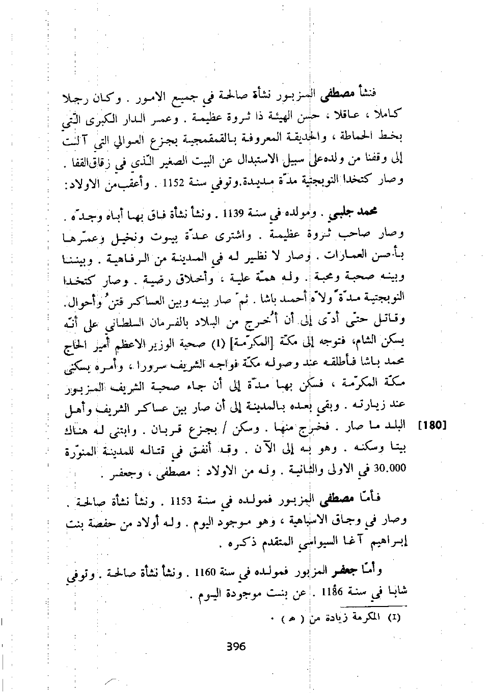 فنشأ مصطفى المزبور نشأة صالحة في جميع الأمور. وكان رجلاً كاملاً، عاقلاً، حسن الهيئة ذا ثروة عظيمة. وعمر الدار الكبرى التي بخط الحماطة، والحديقة المعروفة بالقمقمجية بجزع العوالي التي آلت إلى وقفنا من ولده على سبيل الاستبدال عن البيت الصغير الذي في زقاق القفا. وصار كتخدا النوبجتية مدة مديدة. وتوفي سنة 1152. وأعقب من الأولاد: محمد جلبي. ومولده في سنة 1139. ونشأ نشأة فاق بها أباه وجده. وصار صاحب ثروة عظيمة. واشترى عدة بيوت ونخيل وعمرها بأحسن العمارات. وصار لا نظير له في المدينة من الرفاهية. وبيننا وبينه صحبة ومحبة. وله همة علية، وأخلاق رضية. وصار كتخدا النوبجتية مدة ولاه أحمد باشا. ثم صار بينه وبين العساكر فتن وأحوال. وقاتل حتى أدى إلى أن أخرج من البلاد بالفرمان السلطاني على أنه يسكن الشام، فتوجه إلى مكة " المكرمة " صحبة الوزير الأعظم أمير الحاج محمد باشا فأطلقه عند وصوله مكة فواجه الشريف سروراً، وأمره بسكنى مكة المكرمة، فسكن بها مدة إلى أن جاء صحبة الشريف المزبور عند زيارته. وبقي بعده بالمدينة إلى أن صار بين عساكر الشريف وأهل البلد ما صار. فخرج منها. وسكن بجزع قربان. وابتنى له هناك بيتاً وسكنه. وهو به الآن. وقد أنفق في قتاله للمدينة المنورة 30. 000 في الأولى والثانية. وله من الأولاد: مصطفى، وجعفر.