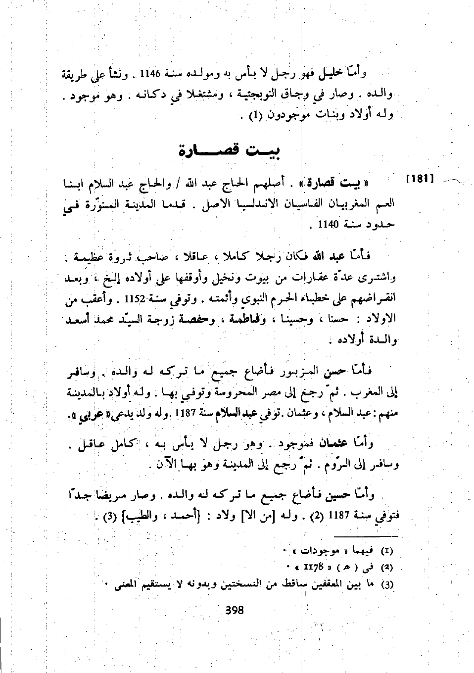 " بيت قصارة ". أصلهم الحاج عبد الله والحاج عبد السلام ابنا العم المغربيان الفاسيان الأندلسيا الأصل. قدما المدينة المنورة في حدود سنة 1140.
