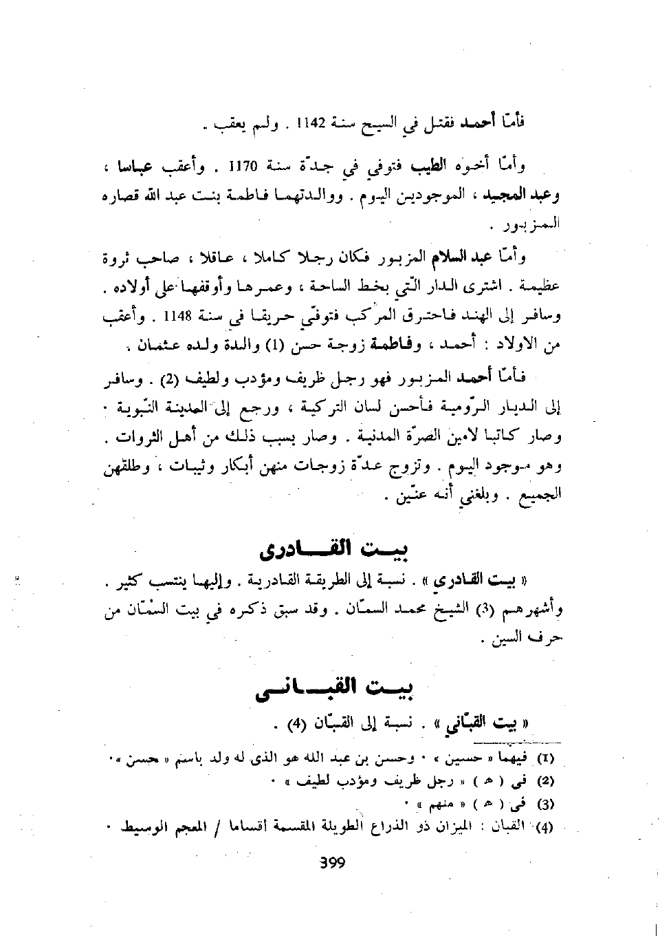 وأما عبد السلام المزبور فكان رجلاً كاملاً، عاقلاً، صاحب ثروة عظيمة. اشترى الدار التي بخط الساحة، وعمرها وأوقفها على أولاده. وسافر إلى الهند فاحترق المركب فتوفي حريقاً في سنة 1148. وأعقب من الأولاد: أحمد، وفاطمة زوجة حسن والدة ولده عثمان.