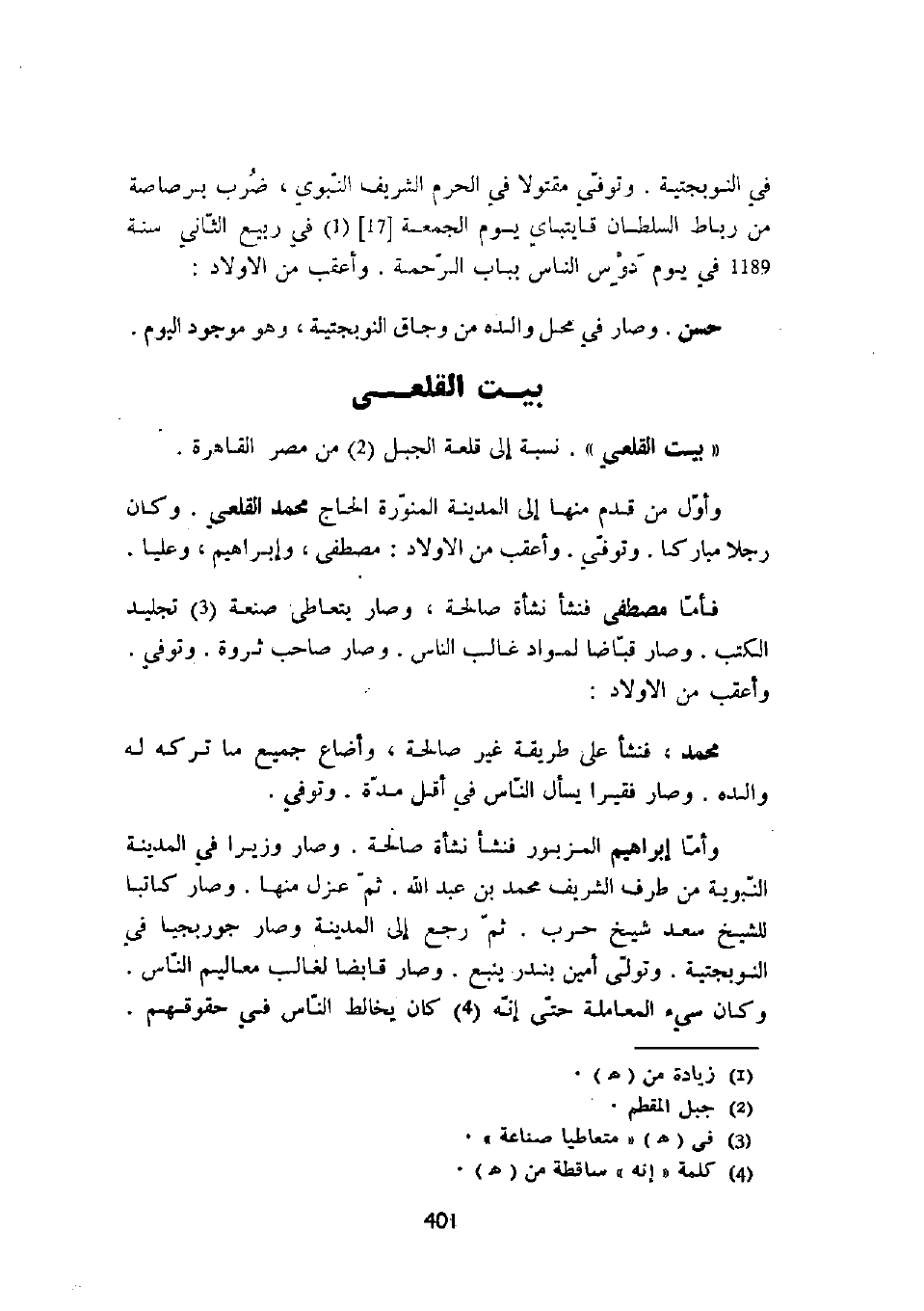 وأول من قدم منها المدينة المنورة الحاج محمد القلعي. وكان رجلاً مباركاً. وتوفي. وأعقب من الأولاد: مصطفى، وإبراهيم، وعلياً.