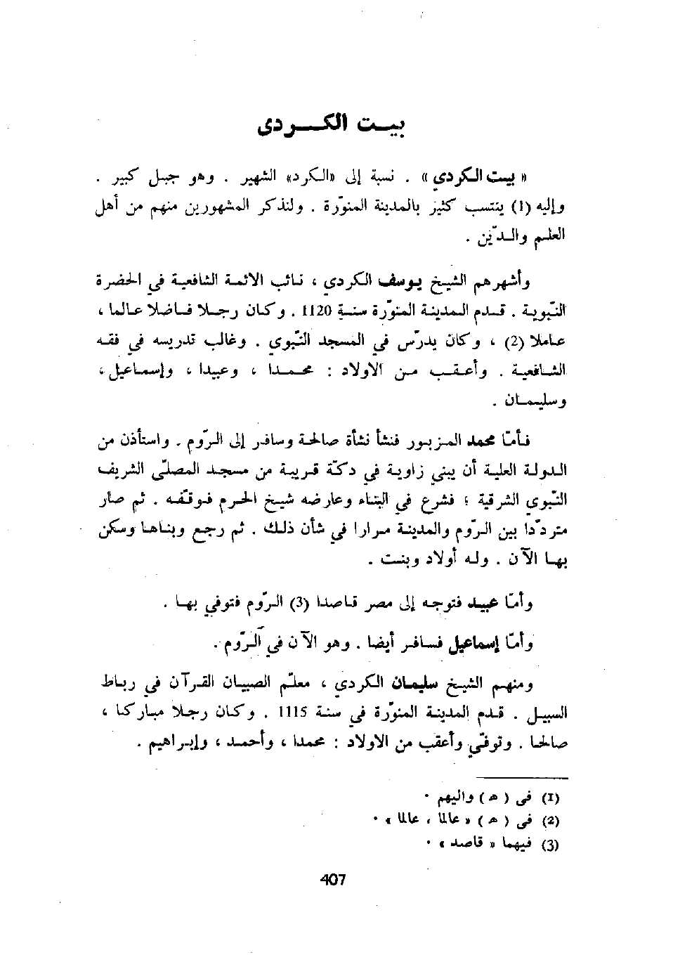 ومنهم الشيخ سليمان الكردي، معلم الصبيان القرآن في رباط السبيل. قدم المدينة المنورة في سنة 1115. وكان رجلاً مباركاً، صالحاً. وتوفي وأعقب من الأولاد: محمداً، وأحمد، وإبراهيم.