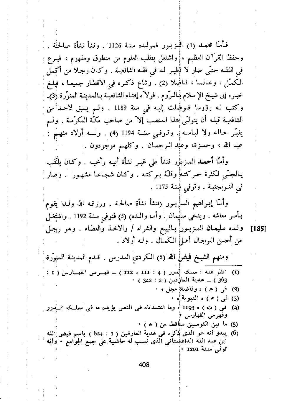 فأما محمد المزبور فمولده سنة 1126. ونشأ نشأة صالحة. وحفظ القرآن العظيم، واشتغل بطلب العلوم من منطوق ومفهوم، فبرع في الفقه حتى صار لا نظير له في فقه الشافعية. وكان رجلاً من أكمل الكمل، وعالماً، فاضلاً. وشاع ذكره في الأقطار جميعاً، فبلغ خبره إلى شيخ الإسلام بالروم. فولاه إفتاء الشافعية بالمدينة المنورة. وكتب له رؤوساً فوصلت إليه في سنة 1189. ولم يسبق لأحد من الشافعية قبله أن يتولى هذا المنصب إلا من صاحب مكة المكرمة. ولم يغير حاله ولا لباسه. وتوفي سنة 1194. وله أولاد منهم: عبد الله، وحمزة، وعبد الرحمان. وكلهم موجودون.