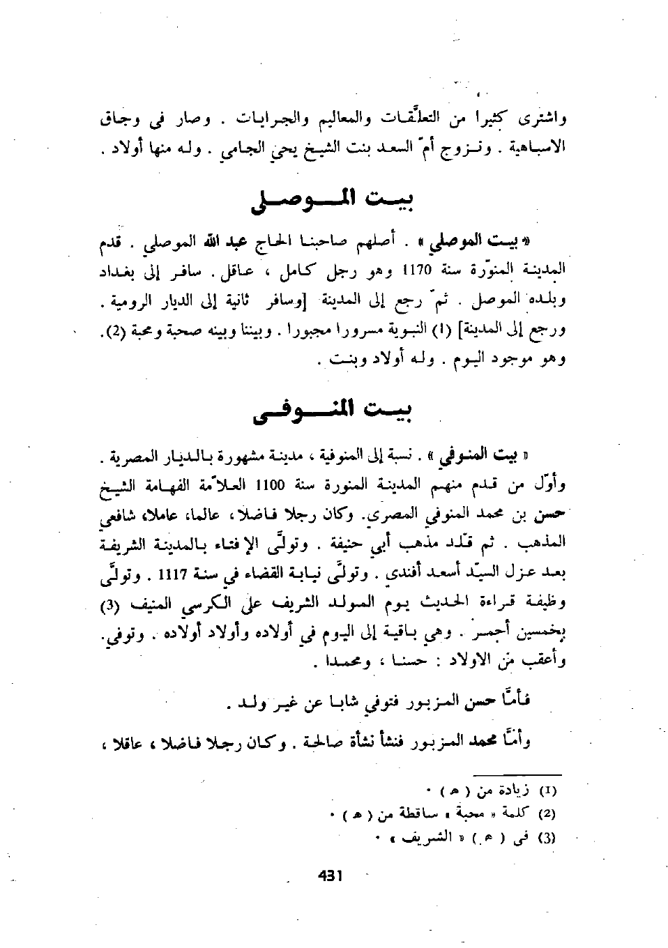 " بيت الموصلي ". أصلهم صاحبنا الحاج عبد الله الموصلي. قدم المدينة المنورة سنة 1170 وهو رجل كامل، عاقل. سافر إلى بغداد وبلده الموصل. ثم رجع إلى المدينة " وسافر ثانية إلى الديار الرومية. ورجع إلى المدينة " النبوية مسروراً مجبوراً. وبيننا وبينه صحبة ومحبة. وهو موجود اليوم. وله أولاد وبنت.