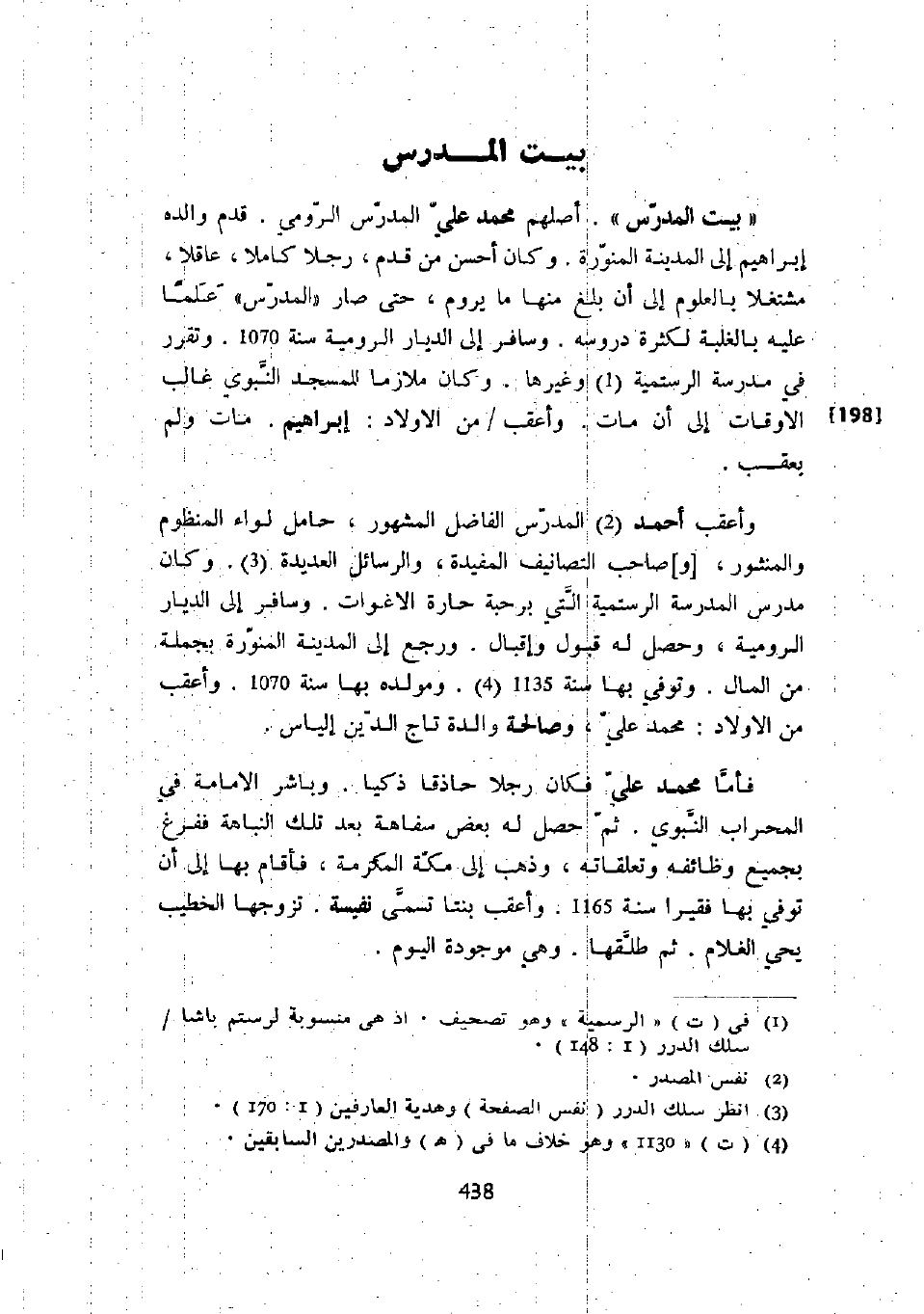 " بيت المدرس ". أصلهم محمد علي المدرس الرومي. قدم والده إبراهيم إلى المدينة المنورة. وكان أحسن من قدم، رجلاً كاملاً، عاقلاً، مشتغلاً بالعلوم إلى أن بلغ منها ما يروم، حتى صار " المدرس " علماً عليه بالغلبة لكثرة دروسه. وسافر إلى الديار الرومية سنة 1070. وتقرر في مدرسة الرستمية وغيرها. وكان ملازماً للمسجد النبوي غالب الأوقات إلى أن مات. وأعقب من الأولاد: إبراهيم. مات ولم يعقب.