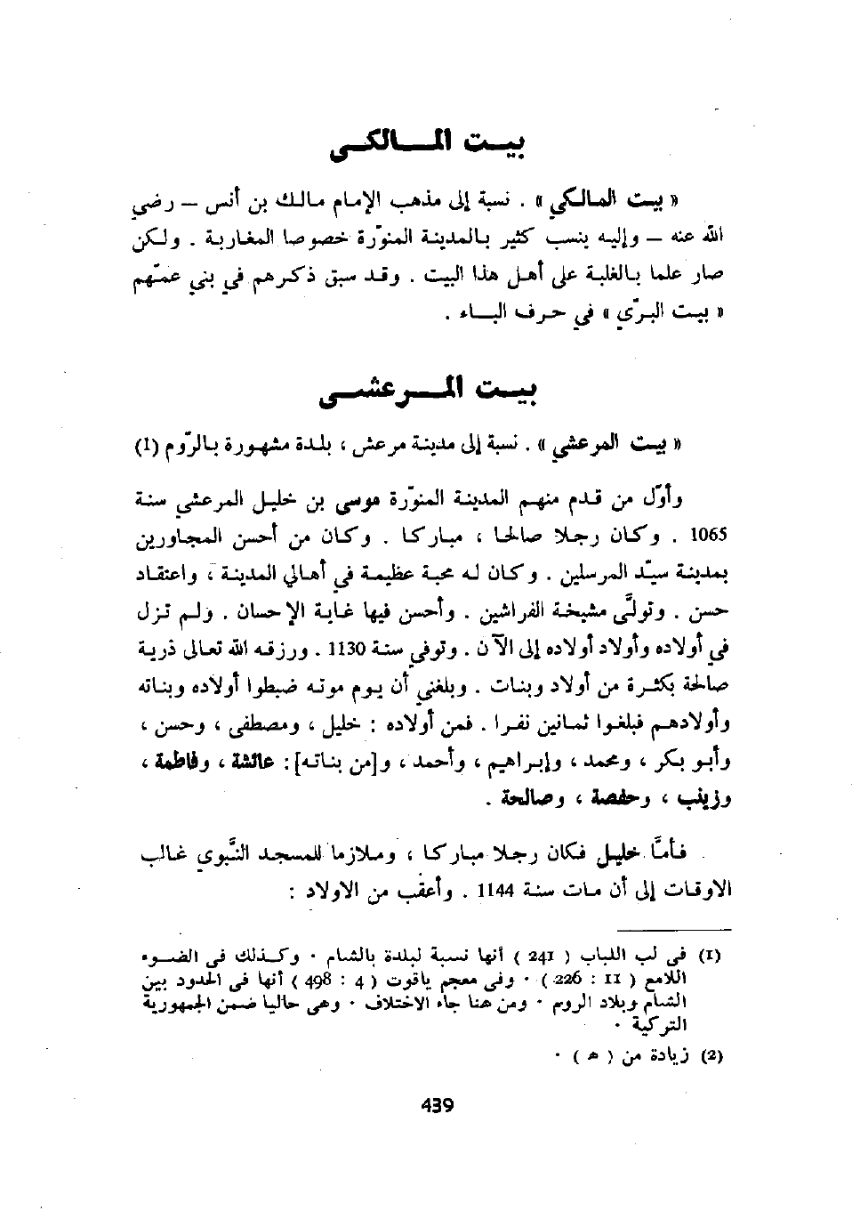 " بيت المرعشي ". نسبة إلى مدينة مرعش، بلدة مشهورة بالروم وأول من قدم منهم المدينة المنورة موسى بن خليل المرعشي سنة 1065. وكان رجلاً صالحاً، مباركاً. وكان من أحسن المجاورين بمدينة سيد المرسلين. وكان له محبة عظيمة في أهالي المدينة، واعتقاد حسن. وتولى مشيخة الفراشين. وأحسن فيها غاية الإحسان. ولم تزل في أولاده وأولاد أولاده إلى الآن. وتوفي سنة 1130. ورزقه الله تعالى ذرية صالحة بكثرة من أولاد وبنات. وبلغني أن يوم موته ضبطوا أولاده وبناته وأولادهم فبلغوا ثمانين نفراً. فمن أولاده: خليل، ومصطفى، وحسن، وأبو بكر، ومحمد، وإبراهيم، وأحمد، و " من بناته ": عائشة، وفاطمة، وزينب، وحفصة، وصالحة.