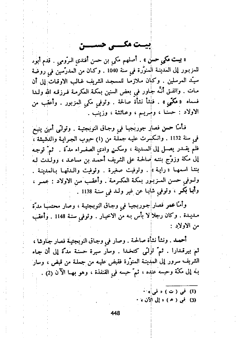 " بيت مكي حسن ". أصلهم مكي بن حسن أفندي الرومي. قدم أبوه المزبور إلى المدينة المنورة في سنة 1040. وكان من المدرسين في روضة سيد المرسلين. وكان ملازماً للمسجد الشريف غالب الأوقات إلى أن مات. واتفق أنه جاور في بعض السنين بمكة المكرمة فرزقه الله ولداً فسماه " مكي ". فنشأ نشأة صالحة. وتوفي مكي المزبور. وأعقب من الأولاد: حسناً، ومريم، وعائشة، وزينب.