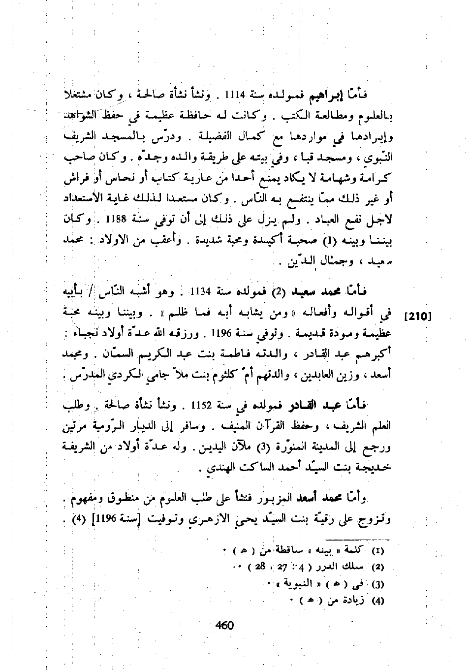 فأما إبراهيم فمولده سنة 1114. ونشأ نشأة صالحة، وكان مشتغلاً بالعلوم ومطالعة الكتب. وكانت له حافظة عظيمة في حفظ الشواهد وإيرادها في مواردها مع كمال الفضيلة. ودرس بالمسجد الشريف النبوي، ومسجد قبا، وفي بيته على طريقة والده وجده. وكان صاحب كرامة وشهامة لا يكاد يمنع أحداً من عارية كتاب أو نحاس أو فراش أو غير ذلك مما ينتفع به الناس. وكان مستعداً لذلك غاية الاستعداد لأجل نفع العباد. ولم يزل على ذلك إلى أن توفي سنة 1188. وكان بيننا وبينه صحبة أكيدة ومحبة شديدة. وأعقب من الأولاد: محمد سعيد، وجمال الدين.