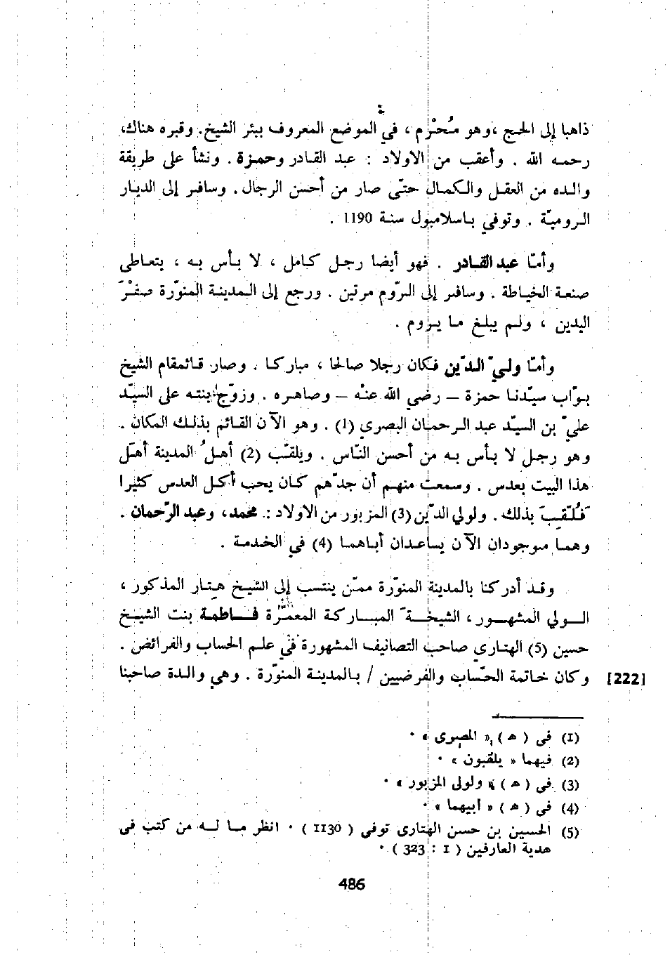 وأما ولي الدين فكان رجلاً صالحاً، مباركاً. وصار قائمقام الشيخ بواب سيدنا حمزة - رضي الله عنه - وصاهره. وزوج بنته على السيد عبد الرحمان البصري. وهو الآن القائم بذلك المكان. وهو رجل لا بأس به من احسن الناس. ويلقب أهل المدينة أهل هذا البيت بعدس. وسمعت منهم أن جدهم كان يحب أكل العدس كثيراً فلقب بذلك. ولولي الدين المزبور من الأولاد: محمد، وعبد الرحمان. وهما موجودان الآن يساعدان أباهما في الخدمة.